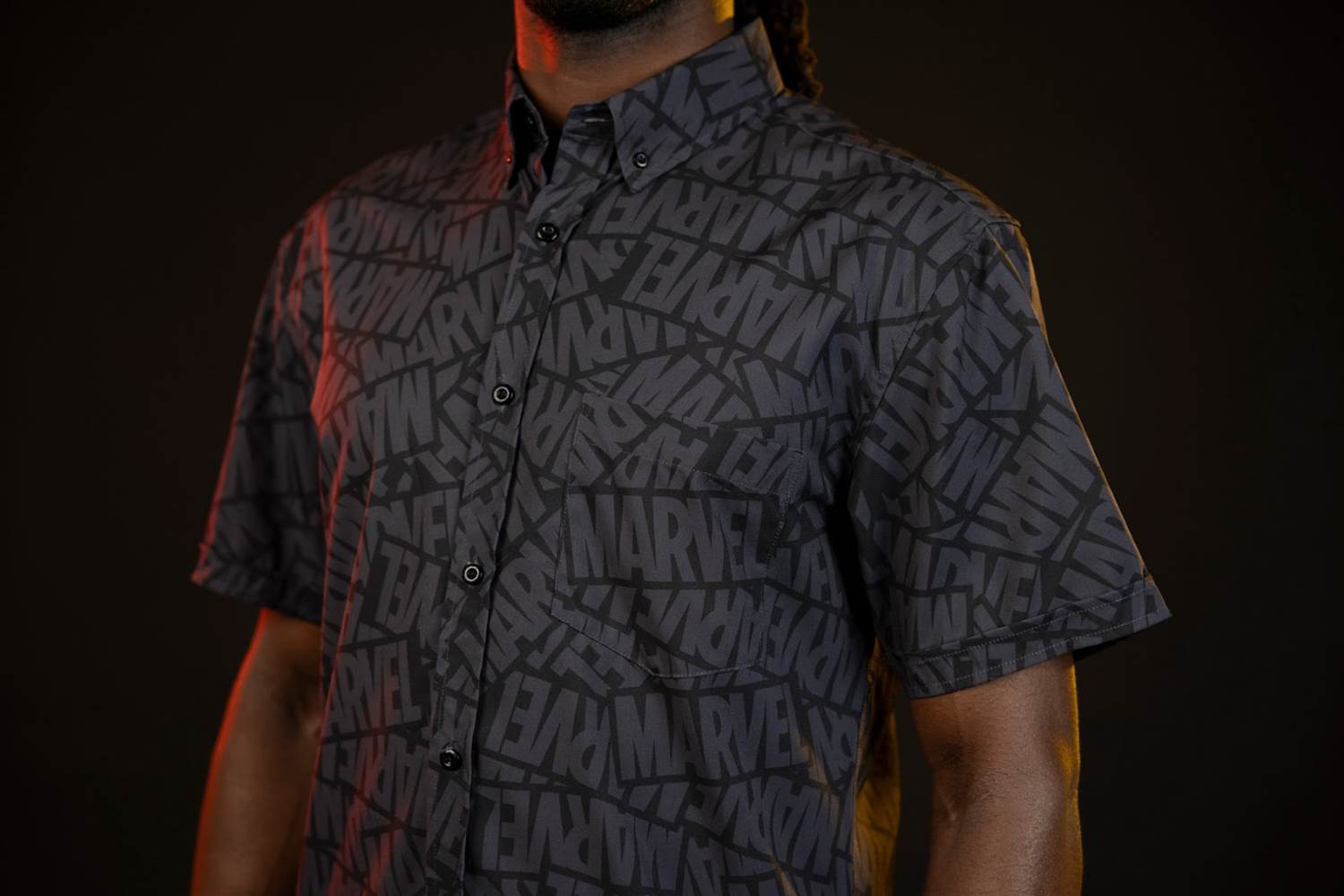- RSVLTS then takes a simple approach with “Make Mine Marvel" a solid black button down decorated with an all grey Marvel logo layered upon itself.