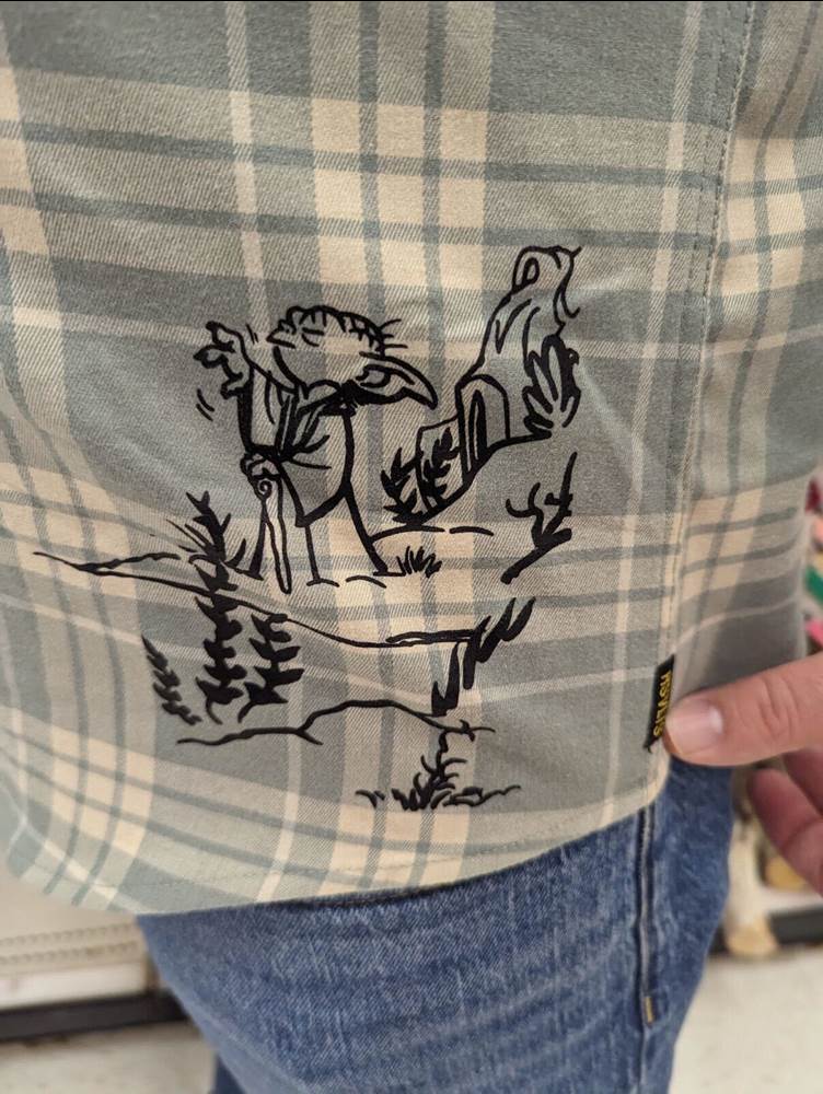 Next I tried out the “Dagobah Flannel Master" shirt ($72) and I’m into this one just as much! Where the Artoo version used blue and grey highlights familiar from the droid’s iconic design for the pattern, more earthy tones like green and tan are represented here, and there’s a fun little sketch of our favorite diminutive Jedi Master in his adopted home on the swamp planet from The Empire Strikes Back. I could see myself wearing both of these to any number of occasions where t-shirts (or tiki shirts) aren’t appropriate.
