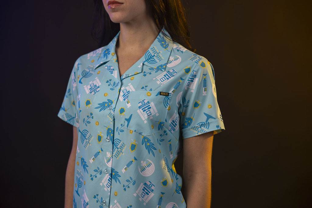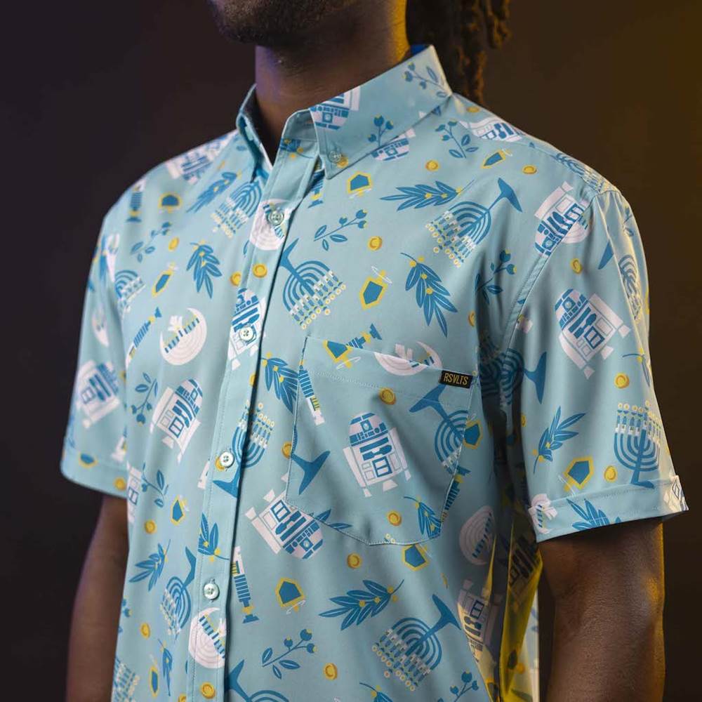 - The third shirt is designed especially for those who celebrate Hanukkah and is titled “Festival of Light Sabers." The light blue backdrop is the perfect color as it allows for everything else to truly pop! R2-D2 is the sole character here and he’s surrounded by menorahs (including one with the Rebel symbol), dreidels, gilt, and greenery.