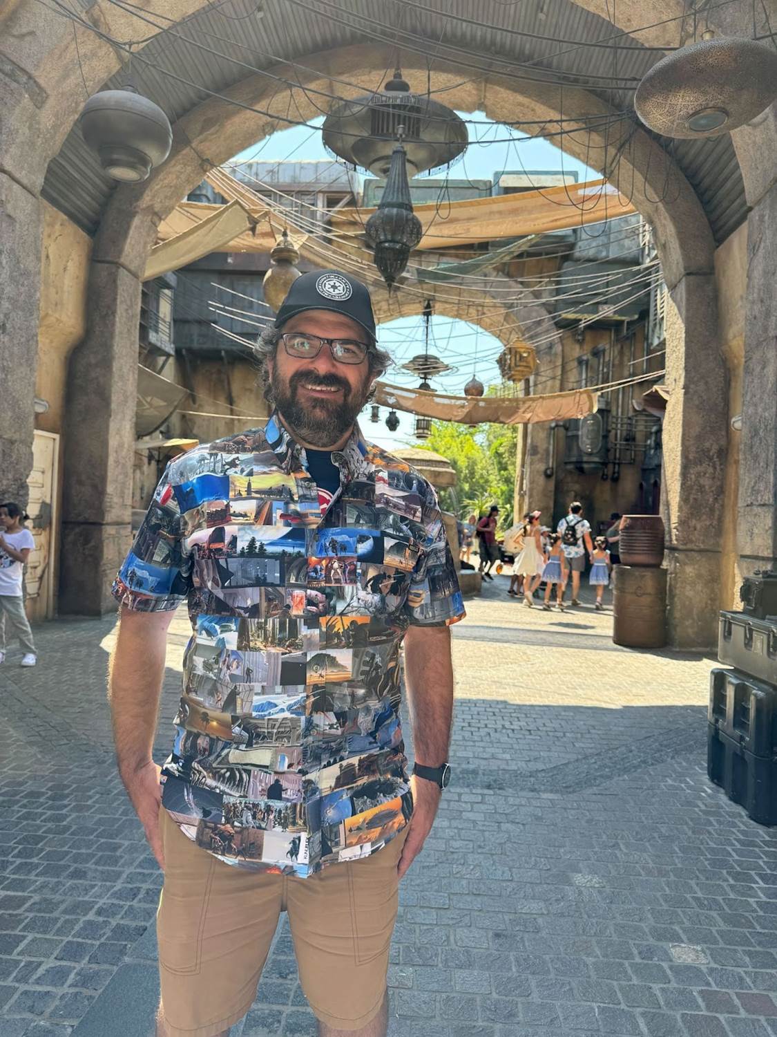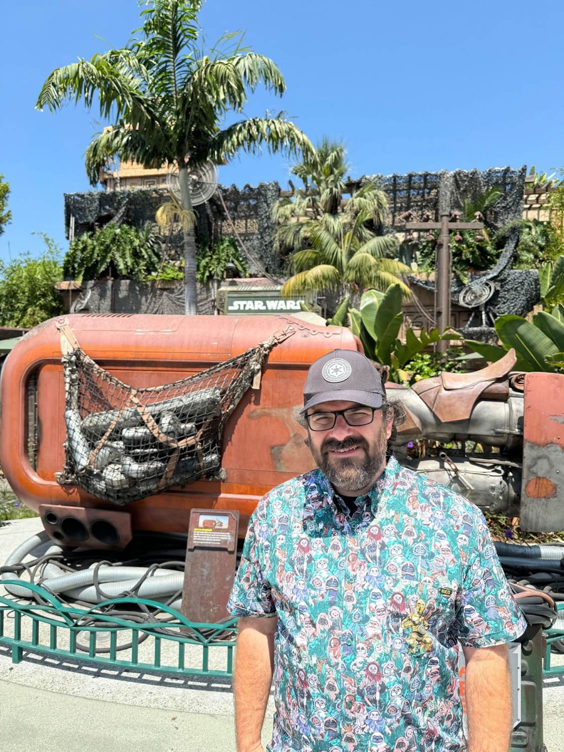 The second shirt I wore to Disneyland Resort this past weekend is a little more light-hearted than “The Art of Wars," but definitely no less fun– and it might have gotten me twice as many compliments! It’s RSVLTS’ Star Wars "The Golden One" KUNUFLEX Short Sleeve Shirt ($70), and it stars those adorable-but-deadly Ewoks from Return of the Jedi. Not only that, but emblazoned across the pocket of this button-down is our favorite protocol droid himself, C-3PO, as he adjusts to his new life of being a Force-floating god to the adorable teddy-bear-like denizens of Endor’s forest moon. As much as people like recognizable concept art, they apparently love Ewoks even more, because I was stopped countless times by Disneyland, Disney California Adventure, and Downtown Disney District guests asking where I got this shirt. It’s colorful, lively, and captures the playful spirit of the third-ever Star Wars movie perfectly. (Imperial cap in both photos provided by Disney Products.)