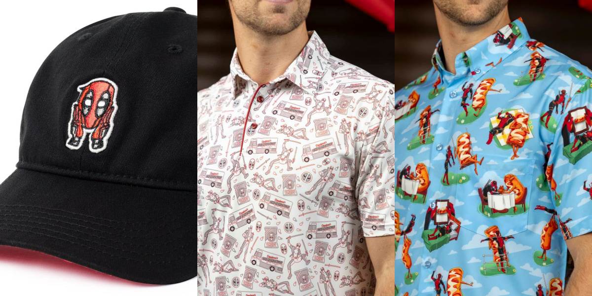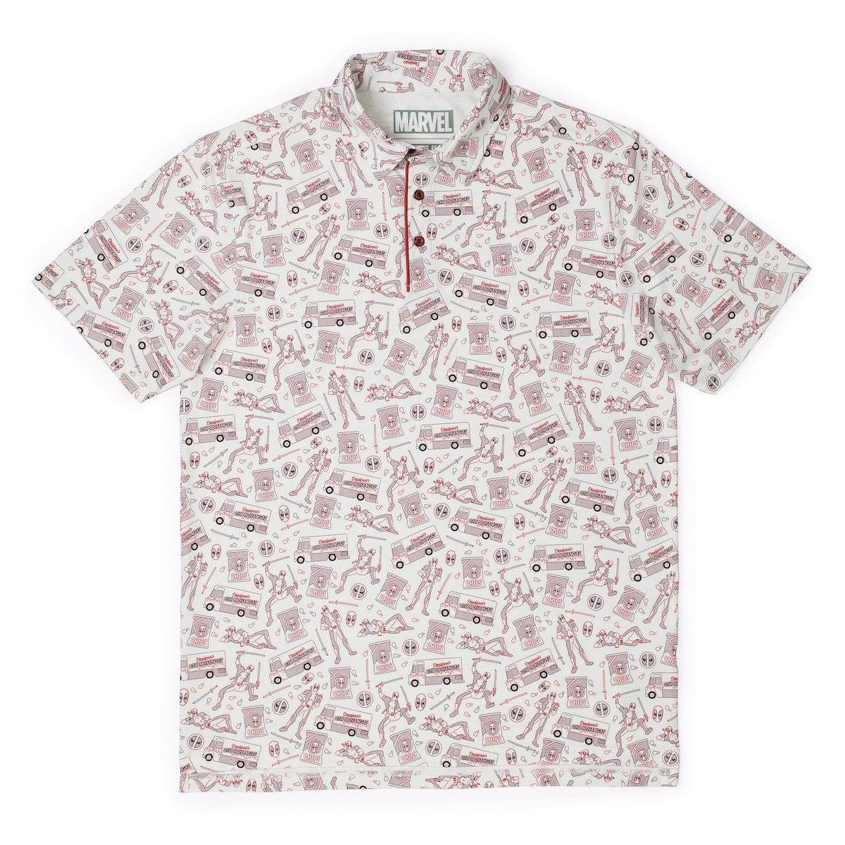 - Switching things up to a comfortable polo that’s great for a day on the green is, “Wicked Slice" featuring rows of stripes made up of miniature swords. Another Deadpool touch is the small patch on the chest with our beloved anti-hero lying down in an alluring pose.