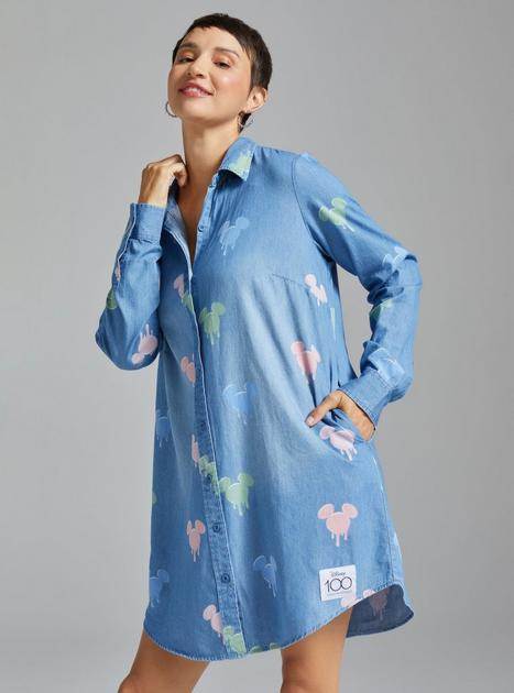 Disney 100 Mickey Mouse Allover Print Button-Down Denim Shirt Dress - BoxLunch Exclusive