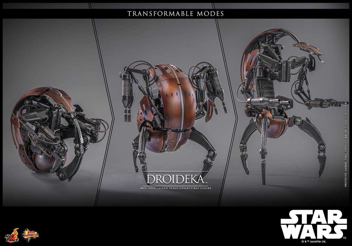 - Sideshow Collectibles: “In celebration of the 25th anniversary of Star Wars: The Phantom Menace, Hot Toys brings this dangerous droid to life in stunning detail with the Droideka™ 1/6 Scale Collectible Figure. Highly articulated, with a poseable head, blaster arms, and grasper legs, this impressive and highly-collectible action figure can also be transformed into the Droideka's ball form. Standing at approximately 13 inches (33cm) tall, this meticulously crafted figure is intricately detailed with wired tubes and a weathered metallic copper finish."