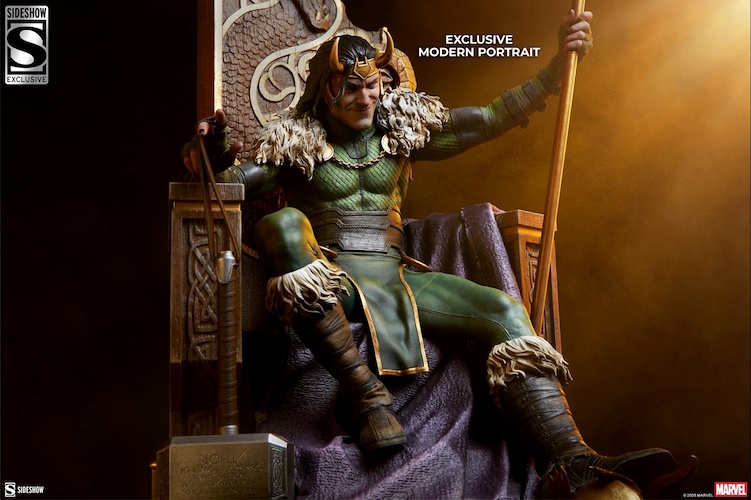 - Sideshow Collectibles: “Presiding over his newly won kingdom, Loki wears a sleek green suit and brown boots, with sculpted fur trim around his shoulders and knees. The classic portrait showcases his maniacal smile and features a gold helmet with twisting horns. The Asgardian prince sits atop an intricately detailed throne complete with purple drapery, a woodgrain texture, and gold engravings — including a ram and snake which reference Thor and Loki’s mythological rivalry."