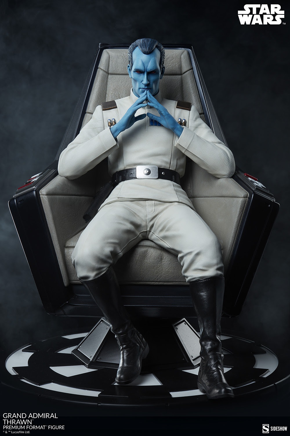 - “The Grand Admiral Thrawn Premium Format Figure also features two alternate portraits, one is a stylized version and the other has a more realistic look. Additional swap-out hands, matching the headsculpts’ differing blue complexions, allow collectors to capture the character’s power and prestige."