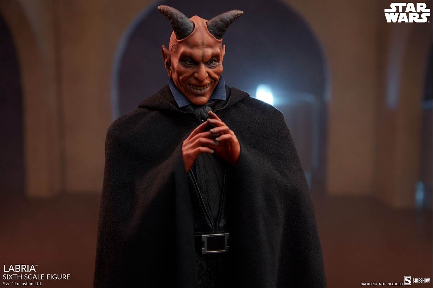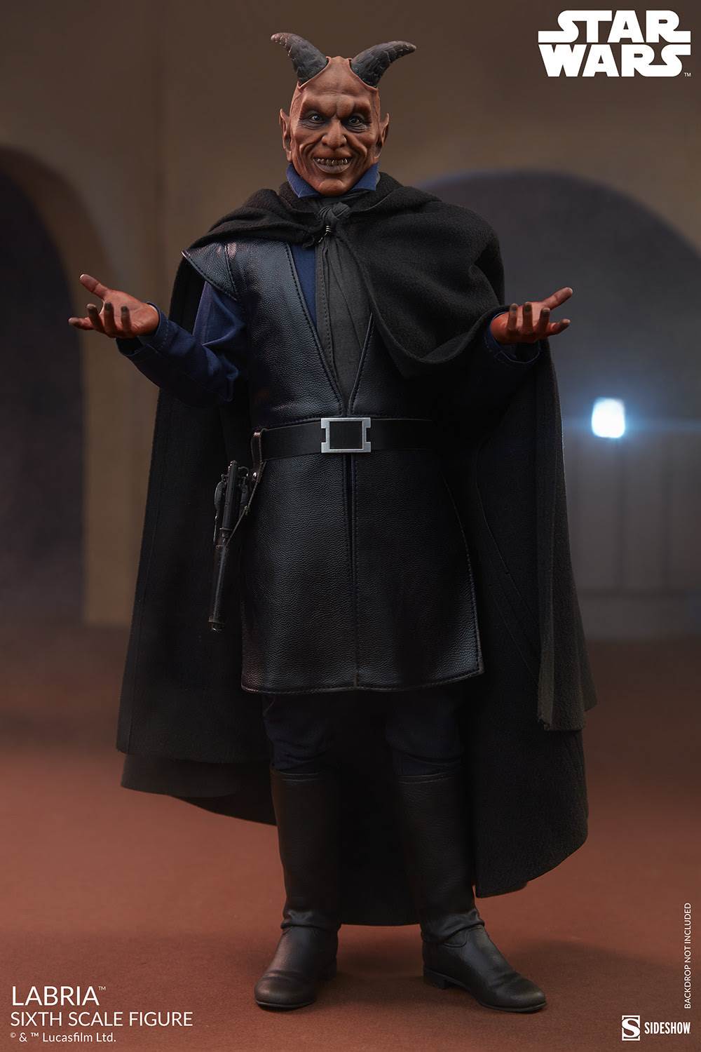 - Sideshow: “The Labria 1/6 Scale High-End Collectible Figure by Sideshow captures the striking look of this character based on his appearance in Star Wars: A New Hope. This fully articulated 1/6 scale high-end collectible figure is highly poseable and comes with swap-out hands for additional display options. The detailed headsculpt features his distinctive curved horns, red-hued skin, and pointed yellow teeth."