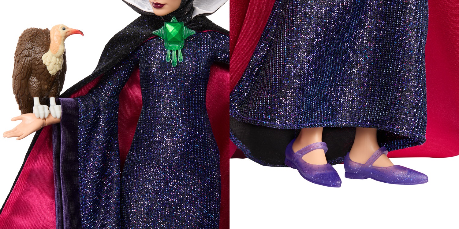 - The Evil Queen dons a sparkling blue gown with long exaggerated sleeves, a dramatic collared black cape with red lining, an emerald brooch and a stained glass-inspired crown. The villainous stepmother carries her signature poisoned apple, a royal scepter and a pet vulture.