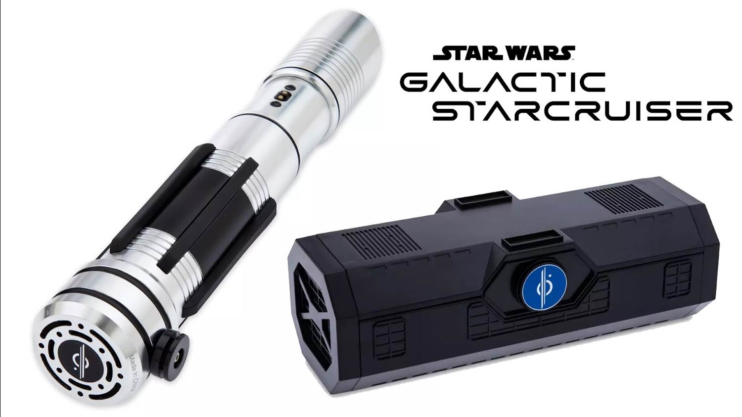 - Disney Store: “Hone your skills with the Galactic Starcruiser Lightsaber hilt, inspired by the training Lightsabers found on the Halcyon Starcruiser of the famed Chandrila Star Line. Personalize it with one of the 26 interchangeable Aurebesh letter charms found in the hilt case. This sought-after hilt features sound effects and illuminates blue when you attach one of our Lightsaber Blades, sold separately. The Chandrila Star Line logo is featured on the case and the bottom of the hilt, but the moment you put your stamp on it, the hilt is yours alone."