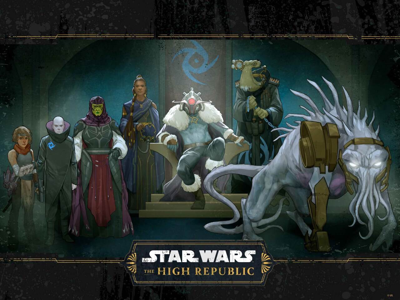 For light and life, enjoy this free Star Wars: The High Republic poster set by the great Phil Noto; it features some of the acclaimed publishing initiative's greatest villains, including (from left to right): Driggit Parse, Niv Dendrow Apruk, General Viess, Ghirra Starros, Marchion Ro, Baron Boolan, and the Nameless creature.