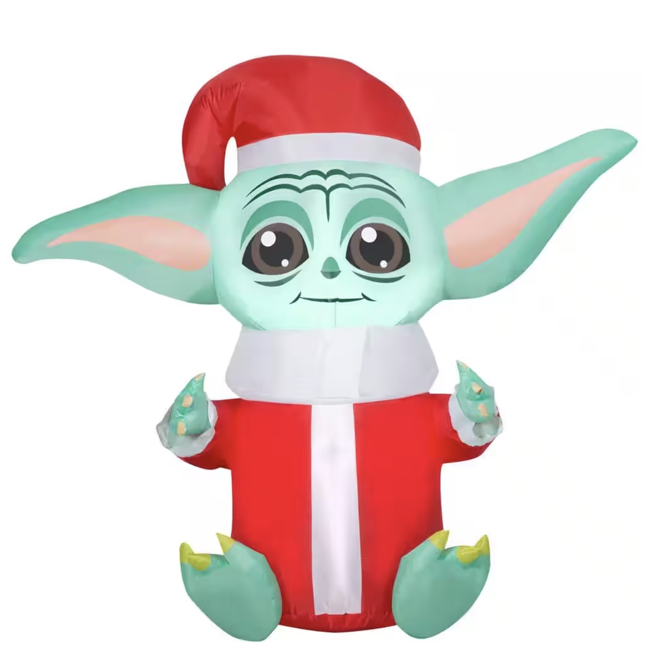 4.6 ft. Tall X 3.2 ft. W Christmas Inflatable Airblown-Stylized Grogu in Santa Suit from Home Depot ($64.98) - “Fans of Star Wars: The Mandalorian will love this Airblown Inflatable Grogu. Wearing a red Santa suit and hat, our Grogu inflatable makes a stellar addition to your indoor or outdoor Christmas decorations. Setup is a snap for the easiest holiday decorating ever. Just plug in your inflatable, stake it down and watch the magic unfold. Display this Star Wars Christmas inflatable as a standalone or combine it with other Airblown Inflatables to create a custom scene. Includes everything needed for easy setup."