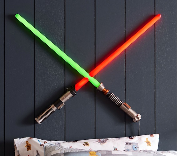 Star Wars LED Lightsaber Wall Decor from Pottery Barn Kids ($199) - “Their Star Wars adventure awaits with this wall decor replica of Darth Vader and Luke Skywalker’s iconic lightsabers clashing together. Your young Jedi will love watching the red and green LED lights illuminate their space."