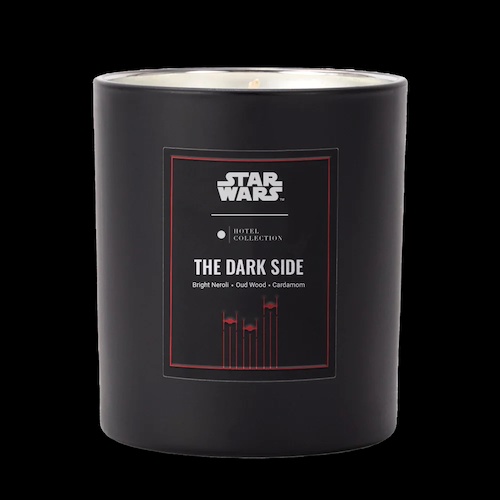 Star Wars Classic Dark Side Candle from Hotel Collection (currently on sale for $21.98) - “Embark on a captivating olfactory voyage with our 14 oz Dark Side candle. Let the intrigue of Sinister Sage entwine harmoniously with the alluring depths of Patchouli and the exotic allure of Saffron. This scent encapsulates the essence of an unseen cosmic force, beckoning you to delve into the realms of mystery and power."