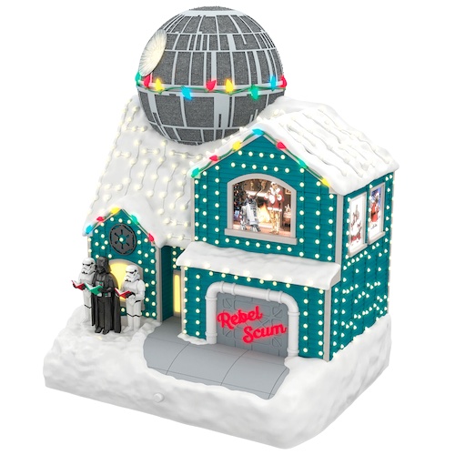 Star Wars The Merriest House in the Galaxy Musical Tabletop Decoration With Light from Hallmark ($134.99) - “Go all out—Star Wars style—with this tabletop decoration! At the push of a button, fans can experience the excitement of the season with this Christmas house that features a trio of caroling lawn decorations—Darth Vader and two Stormtroopers—along with a giant Death Star on its roof. Colorful LED lights provide a constant glow until you press the button on the base. Then you'll see one of two synchronized light and sound performances featuring the iconic strains of ‘Star Wars: Main Title’ and ‘The Imperial March.’ Power adapter included."