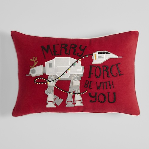 Star Wars Holiday Pillow from Pottery Barn Teen (currently on sale for $29) - “May the Force be with you this holiday season! Celebrate with a festive new pillow featuring an AT-AT being adorned with lights. Made with cotton appliqués on a bright red corduroy background, you’ll be that much closer to feeling like you're visiting a galaxy far, far away…"