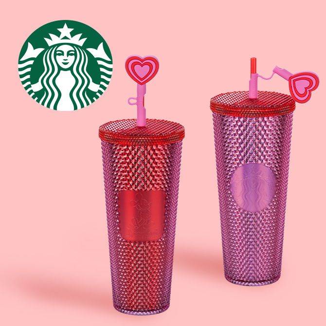- As with all of Starbucks’ classic tumblers this comes with a twist top lid and reusable straw. Also, following the newest trend, each straw comes with a silicone cover and for this seasonal drop it’s red and pink hearts.