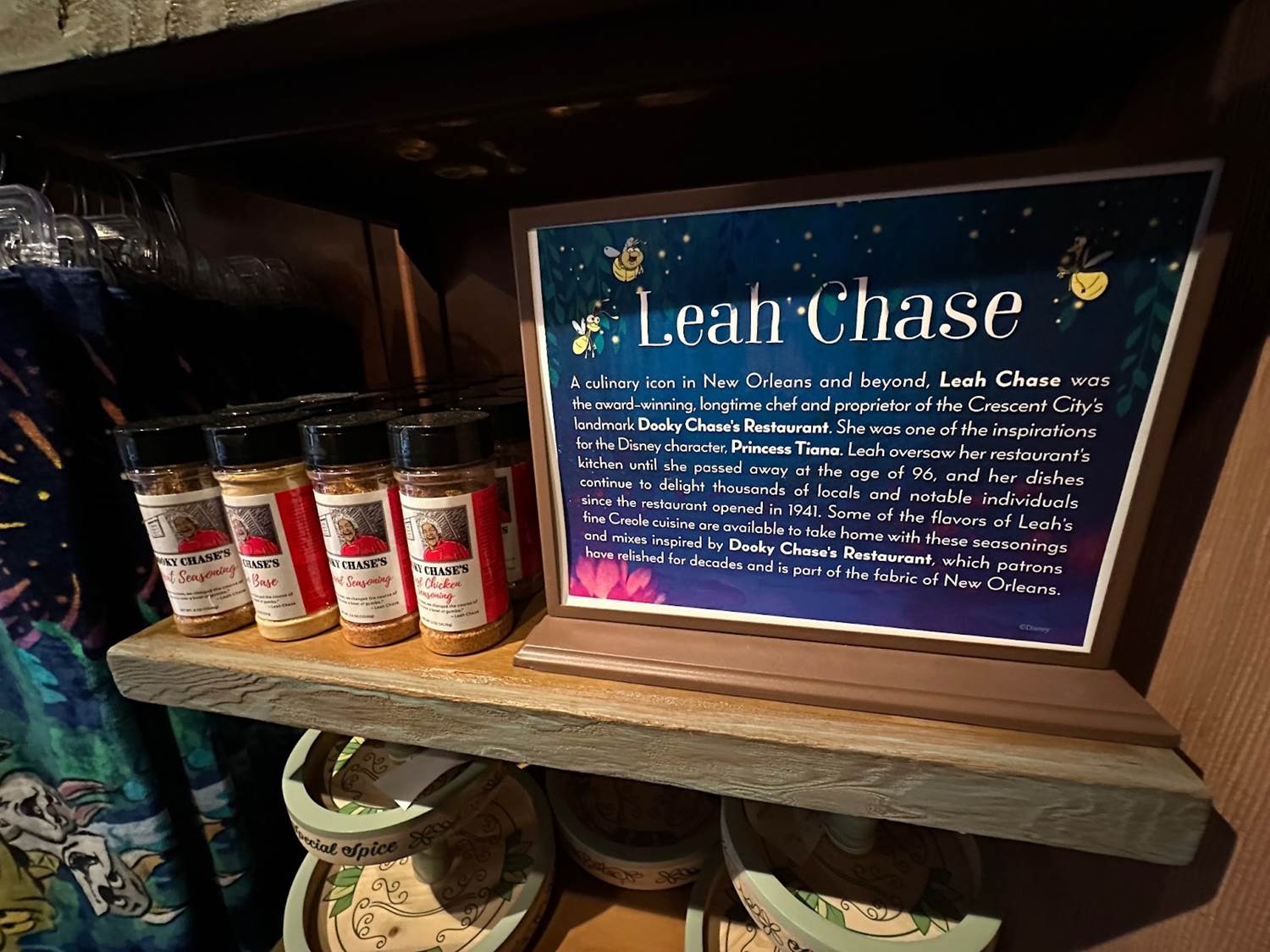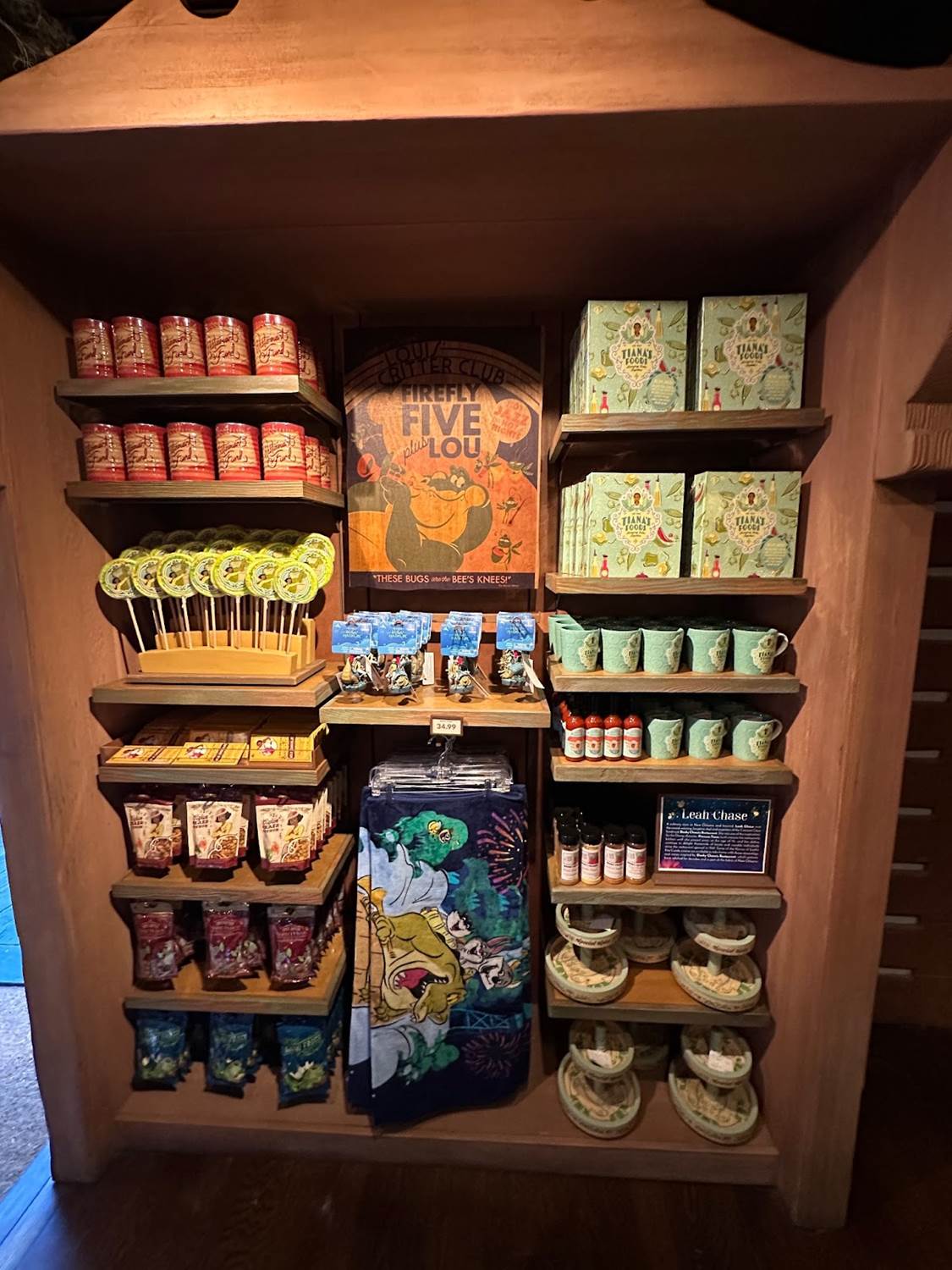 Fitting in with the Tiana’s Food theme of the attraction, Louis’ Critter Club is home to a large food and kitchen section. From new sweet treats to take home (such as the Bananas Foster chocolate bar), to housewares to Tiana-fy your kitchen, to a collection of items from Leah Chase’s restaurant, Dooky Chase. (Chase and the restaurant are the inspiration for Tiana. This is the first time that the restaurant’s spices have been made available outside the restaurant.)