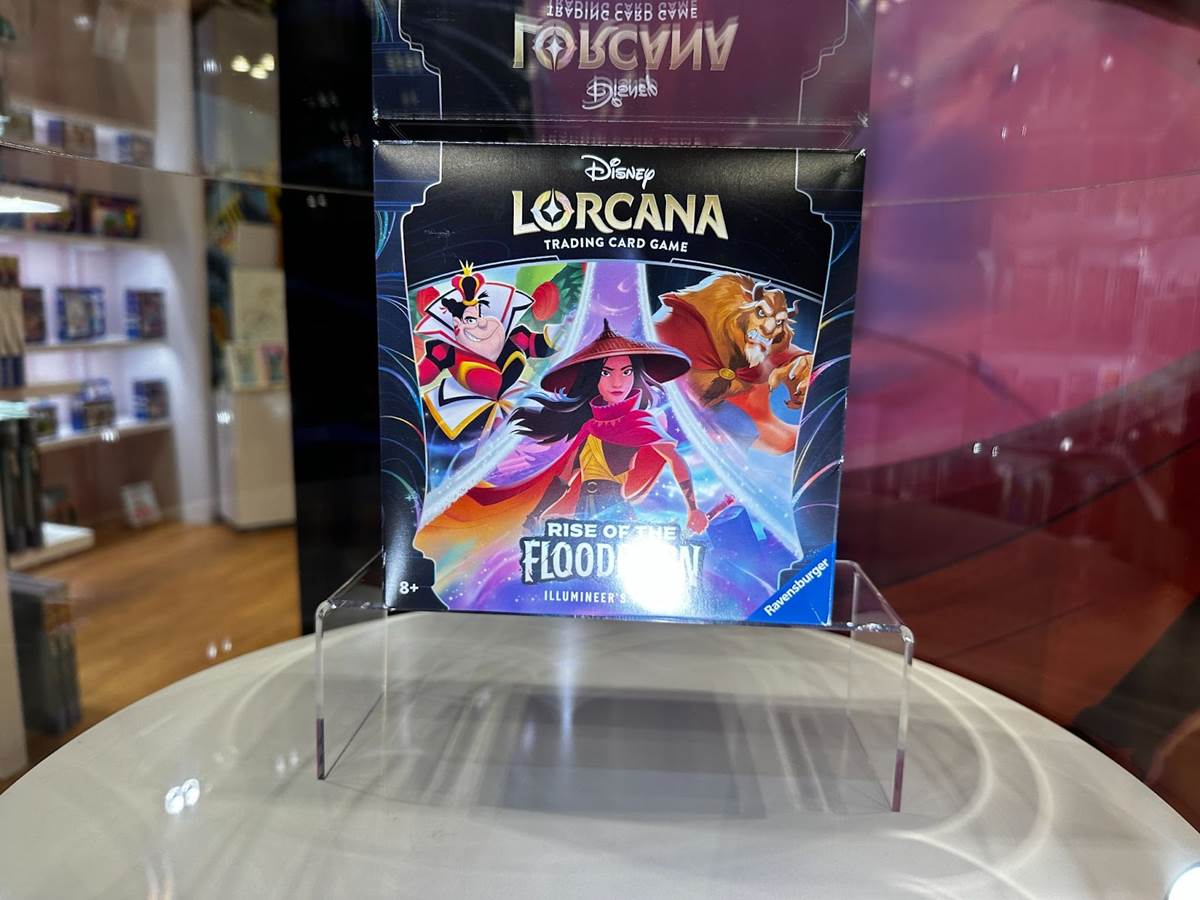 The easiest way to build up your Disney Lorcana: Rise of the Floodborn collection is with this wave’s Illumineer’s Trove, which comes with 8 booster packs, plus a storage box, 2 deck boxes, a player’s guide, and game tokens. The box’s artwork features the characters on this wave’s booster packs.