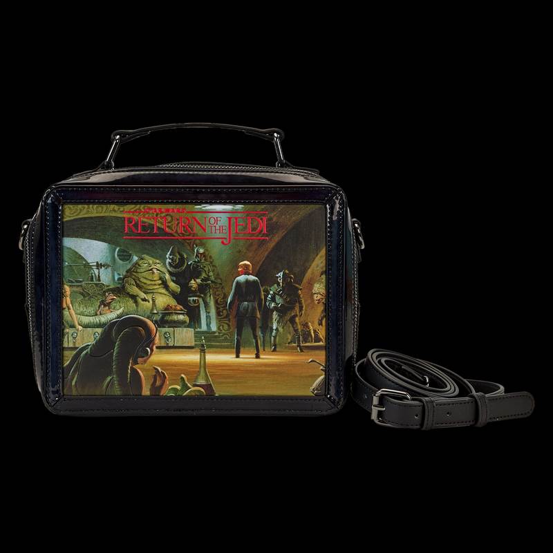 Loungefly Star Wars Return of the Jedi Lunchbox Crossbody Bag ($59.90) - “Even the galaxy’s heroes require a snack or two. Satisfy your appetite for adventure with the Loungefly Return of the Jedi Lunchbox Crossbody Bag! Taking the shape of a rectangular lunchbox, this bag shows scenes from Star Wars: Episode VI – Return of the Jedi across every panel. The front displays a memorable moment at Jabba’s Palace while the back shows a confrontation between Luke Sywalker and Darth Vader. The side panels show C-3P0 with some Ewoks and Max Rebo as he plays an instrument. With plenty of room to store your essentials, this crossbody bag makes the perfect ally for any mission. The Loungefly Return of the Jedi Lunch Box Crossbody Bag is made of vegan leather (polyurethane) and features printed details. Bag has adjustable (detachable) shoulder strap and sturdy metal hardware. Take note of the coordinating inside lining."