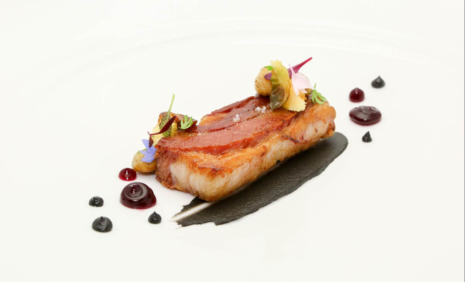 - Smoked Hand-Crafted Bacon, Artisanal Bread Purée, Carrot Purée, Braised Greens, Shaved Vinegared Heirloom Apple