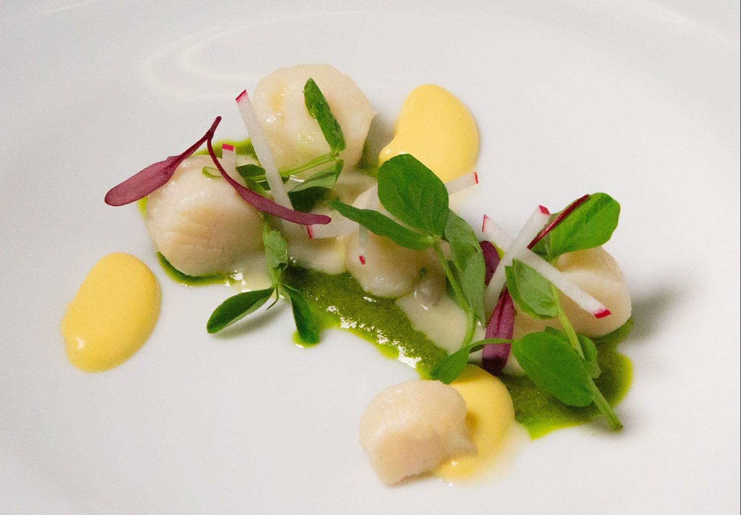 - Butter Poached Bay Scallops, Florida Corn Purée, Charred Scallion Vinaigrette, Radish Threads, Shallot Butter