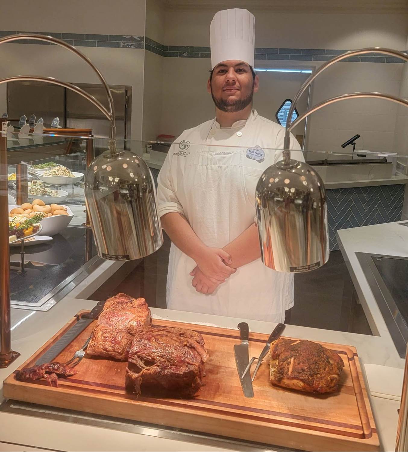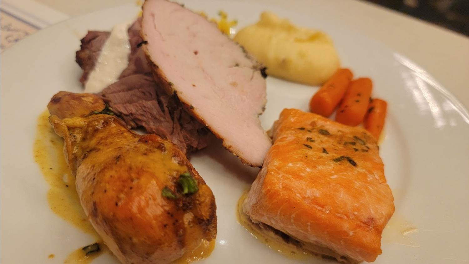 If you are looking for meatless options, the buffet offers an impossible sausage dish with zucchini noodles, a macaroni and cheese dish, a few vegetable side dishes including glazed carrots, substantial salad bar as well as assorted cheeses with breads.