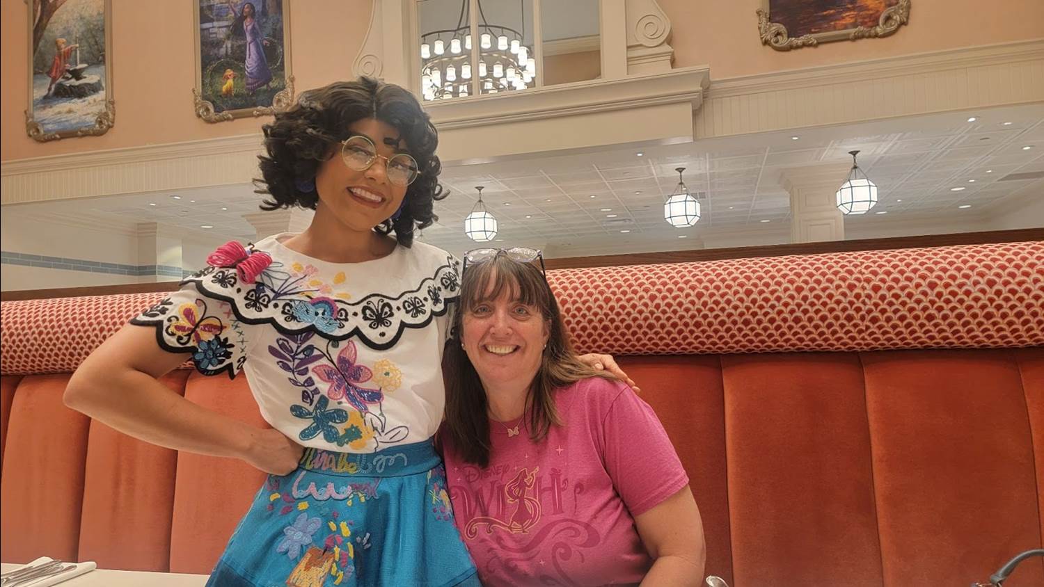At our table, we received an ornate postcard and were invited to write down a wish for a moment later in the meal. I couldn’t think of anything to write and was initially nervous about this. However, our blank card proved quite the conversation starter for the quartet of Disney wishmakers that visited our table - Mirabel, Aladdin, Cinderella and Tiana.