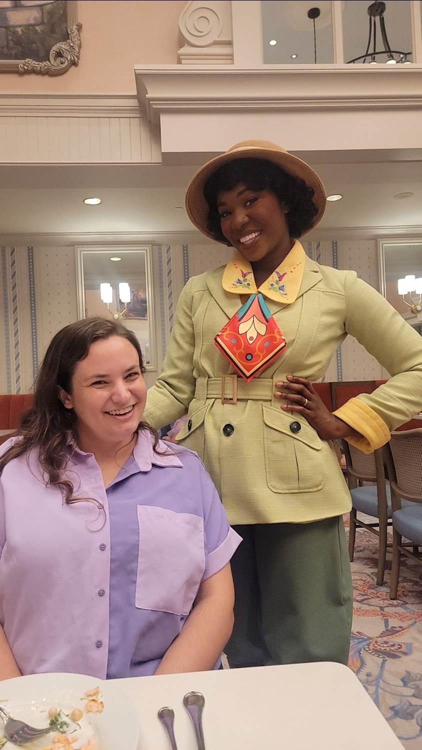 While I was enjoying a Strawberry Rosé Spritz made up of La Fête du Rosé, Rockey’s Botanical Liqueur, Tito’s Handmade Vodka & Strawberry and my friend Morgan was delighting in a Passion Fruit Daiquiri, Encanto’s Mirabel stopped by. After seeing the blank card, she reminded us that we can hold a wish for others and Aladdin offered up his experiences having to narrow down all he wanted into three wishes and encouraged us to write down our wishes so we wouldn’t forget them and remember to hold them in our heart. When Cinderella (our favorite princess) stopped by our table, we discussed dancing at the Royal Ball, her favorite dance partner Prince Charming, and received the advice to be home before midnight. Princess Tiana dressed in her Bayou Adventure outfit chatted with us about her gumbo which is among the buffet items.