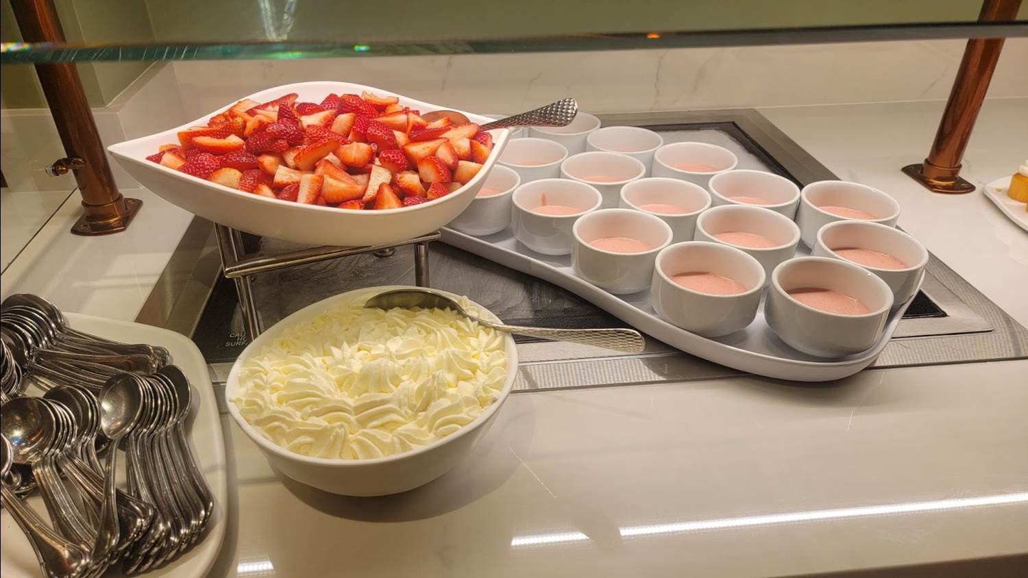Among the buffet highlights are a carving station with prime rib and spice-roasted turkey, baked salmon, large peel-and-eat shrimp, and a variety of comfort foods including macaroni and cheese, pizza, and turkey meatballs. Our host suggested we break tradition and start with dessert to ensure room for the hotel’s signature chilled strawberry soup.