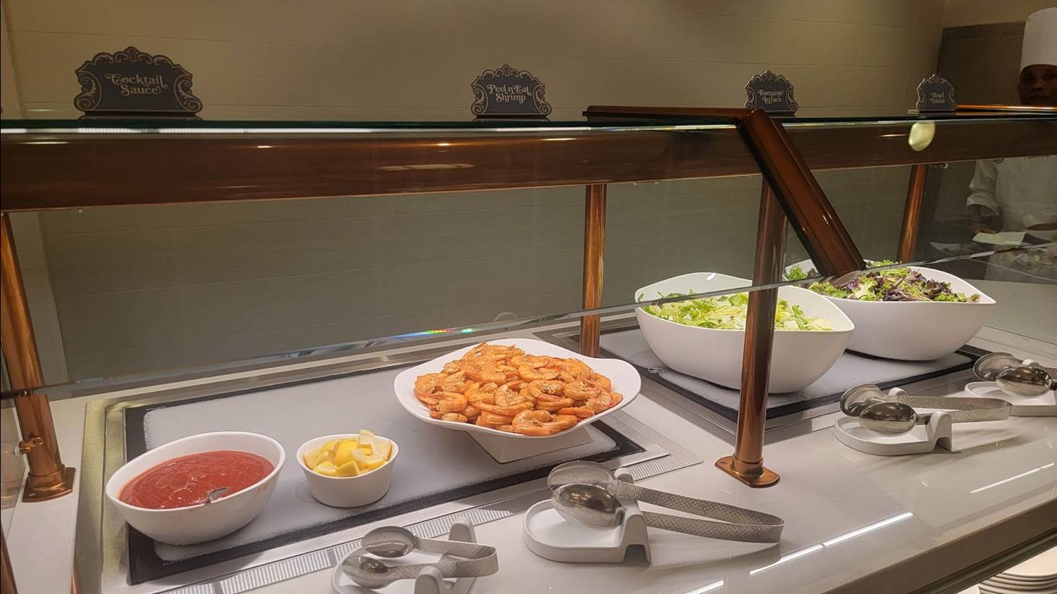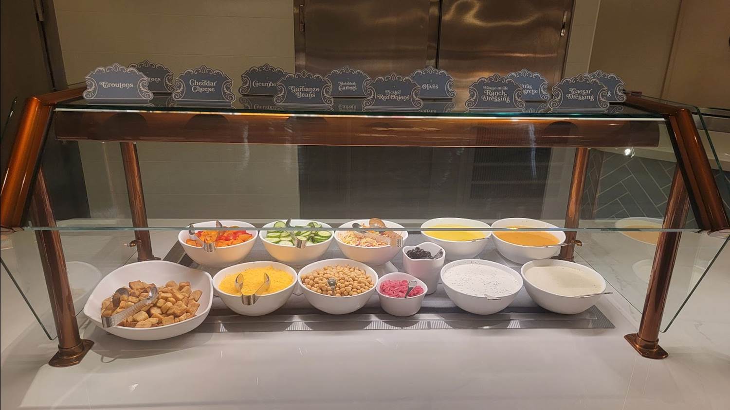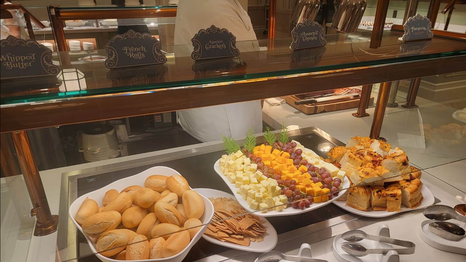 As you enter, you'll pass the multi-station buffet as you go from the check-in lobby to your table. If you’ve been here before, you may notice the large carousel horses have been removed. However, you can still find carousel horses hidden among the wallpaper.