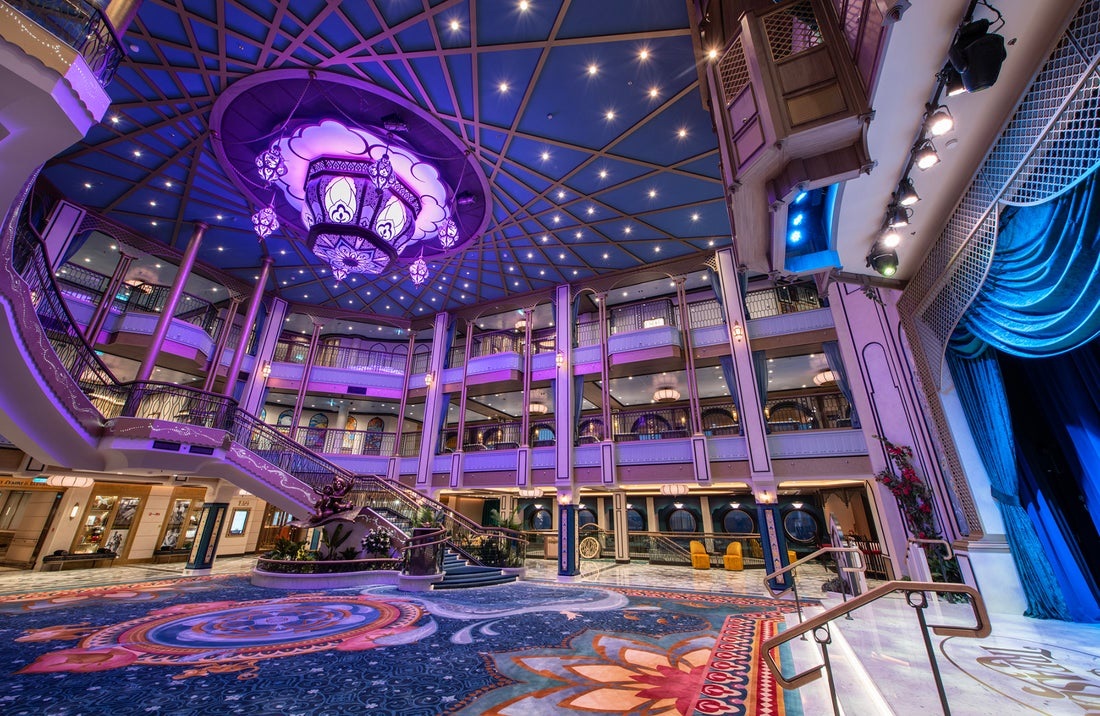 With Aladdin, Jasmine, and Magic Carpet as the atrium statue, all things Aladdin (the 1992 film from Walt Disney Animation Studios) take over nearly every inch of the Grand Hall. Similar to the Disney Treasure’s sister ship, the Disney Wish, which borrows the songs from Cinderella in its Grand Hall (where Cinderella is the statue), songs from Aladdin make up the bulk of the nightly shows.