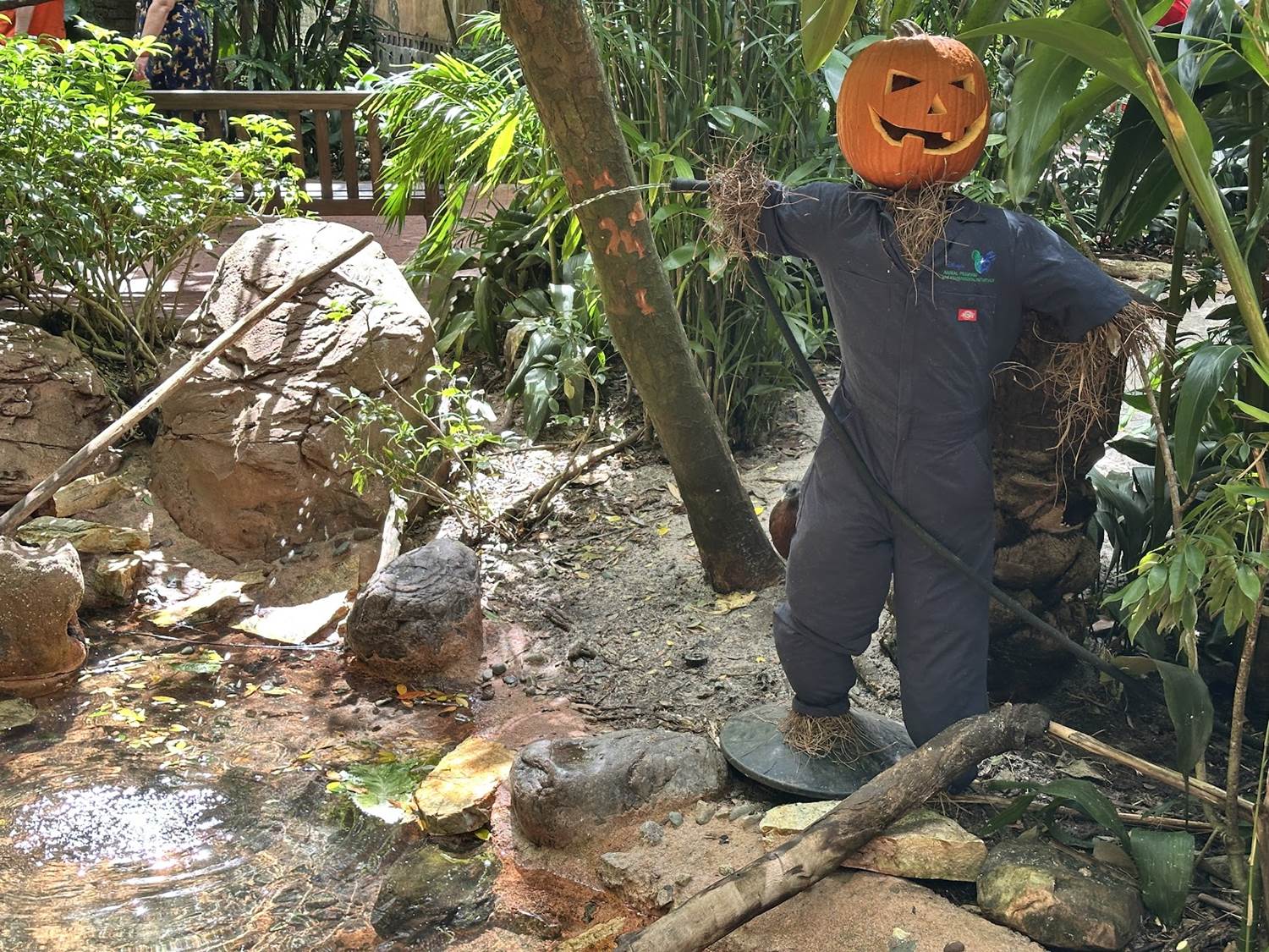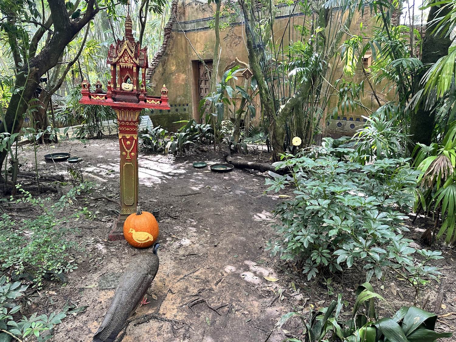 The enrichment items add a level of play and stimulation for the animals at the park, and a new seasonal item definitely will spark their interest and curiosity. Unless of course, it’s time for a nap in the shade. The Maharajah Jungle Trek also features a massive aviary that guests can walk through to see plenty of birds. Here, more pumpkins have been placed, including a pumpkin man, for the feathered friends to perch on.