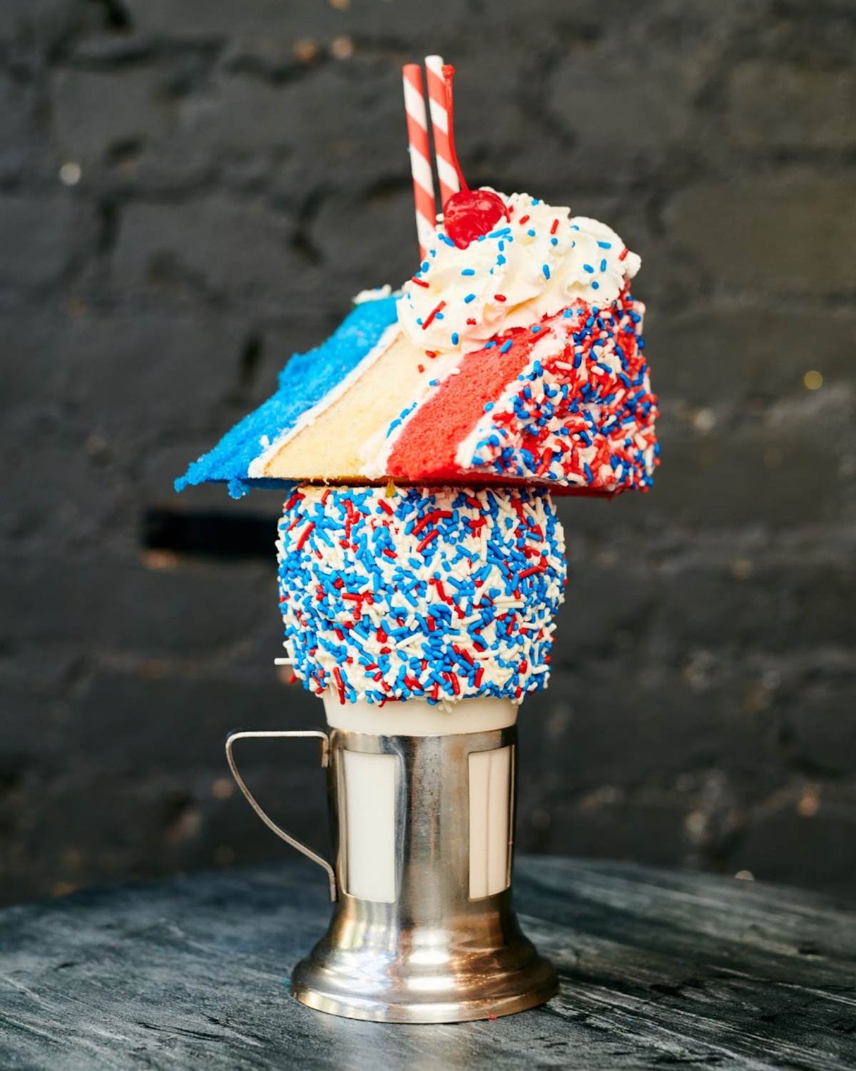 - The vanilla shake features a vanilla frosted rim with red, white, and blue sprinkles topped with red, white, and blue cake, whipped cream, and a cherry.