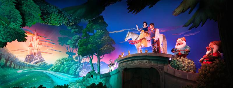 - After saving her from the Witch's death sleep, he eventually takes her with him to his castle on his white steed, as seen in the final scene of the Blanche-Neige et les Sept Nains attraction in Fantasyland.