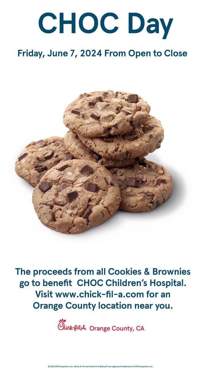 - CHOC Day will take place later this week and 100% of the proceeds from cookie and brownie sales at Chick-Fil-A locations throughout Orange County will go directly to CHOC.