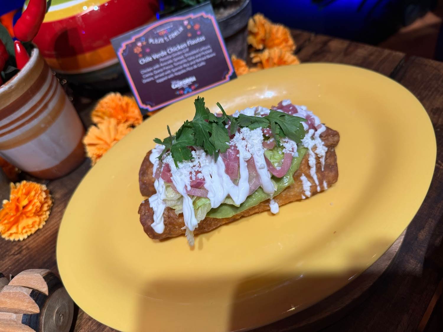 - Chile Verde Chicken Flautas topped with avocado spread, shredded lettuce, crema, queso fresco, tomatillo salsa, and pickled onions served with Spanish rice and refried beans topped with nopales pico de gallo