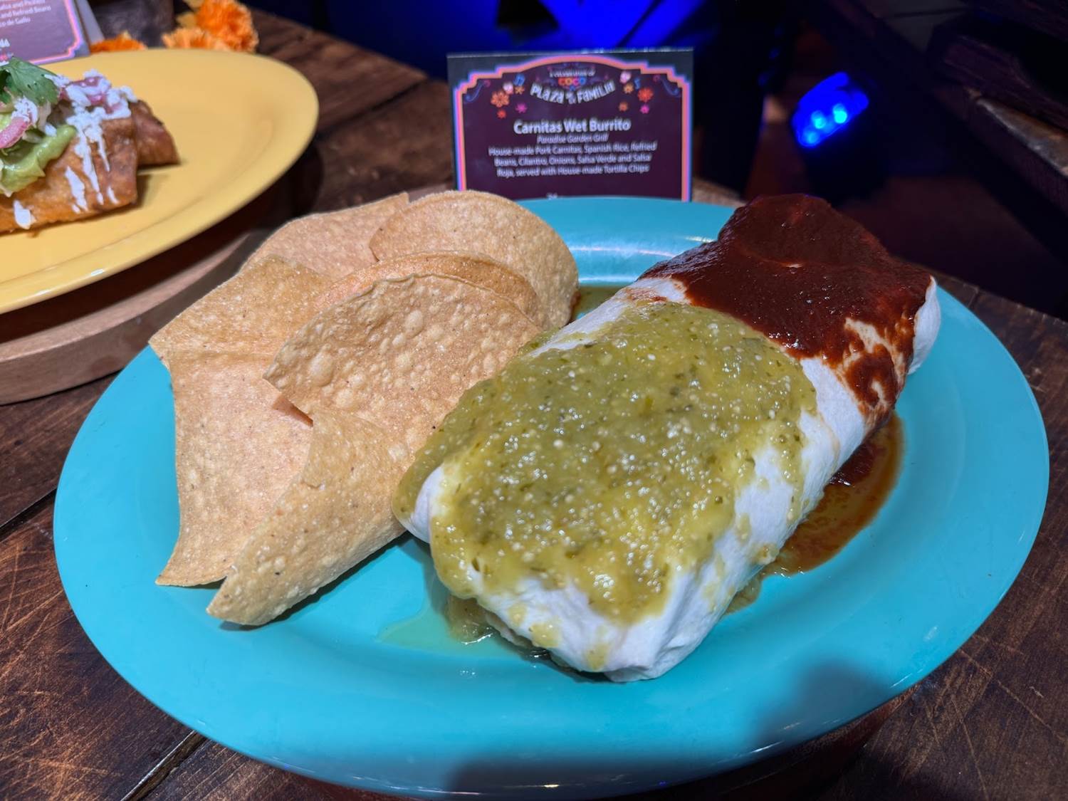 - Carnitas Wet Burrito: House-made pork carnitas, Spanish rice, refried beans, cilantro, onions, salsa verde, and salsa roja served with house-made tortilla chips