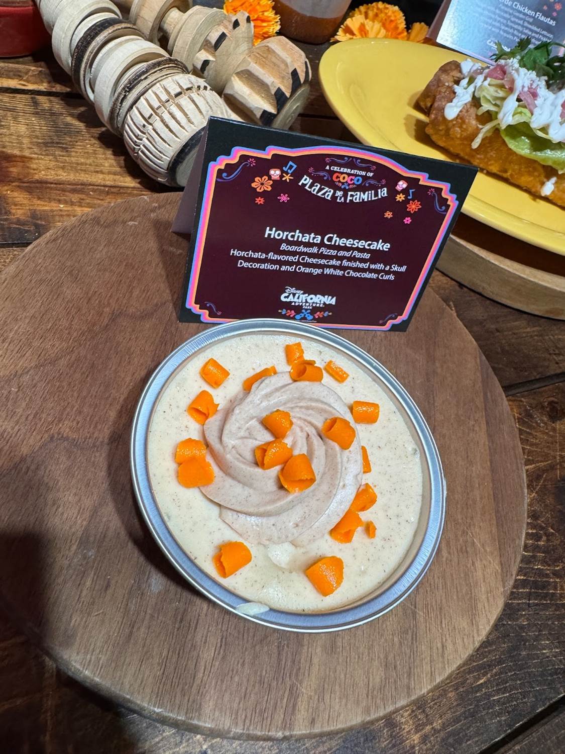 - Horchata Cheesecake: Horchata-flavored cheesecake finished with orange, white chocolate curls