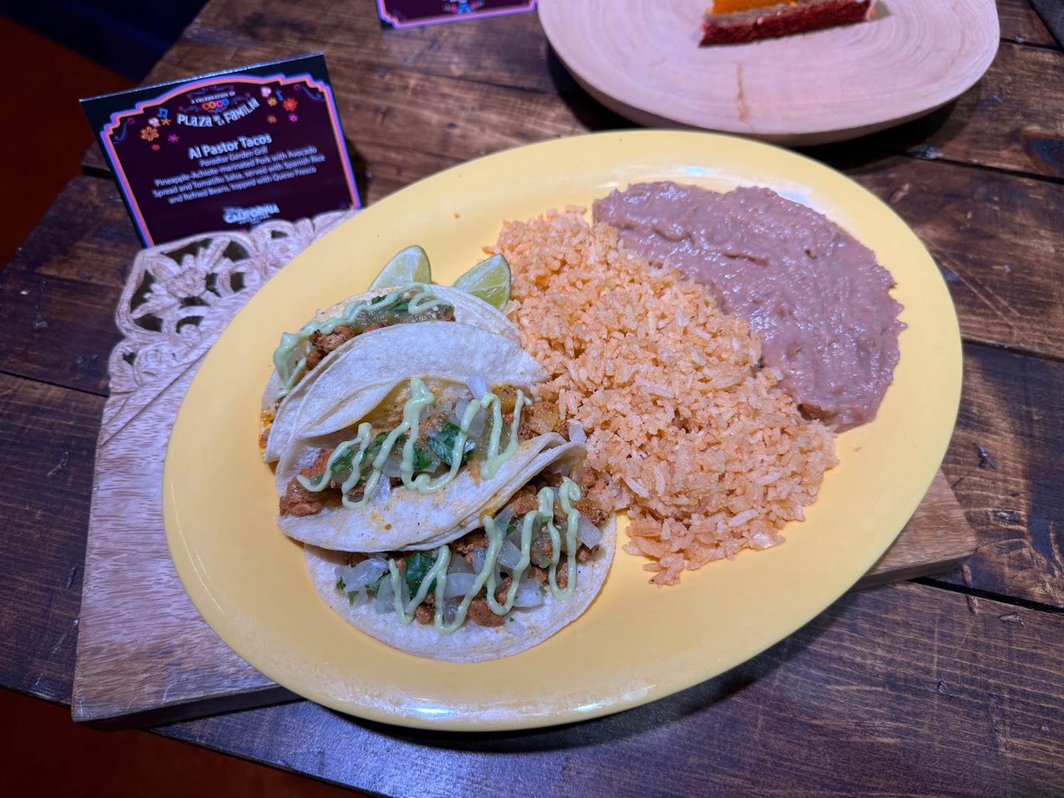 - Al Pastor Tacos: Pineapple-achiote-marinated pork with avocado spread and tomatillo salsa, served with Spanish rice and refried beans topped with queso fresco