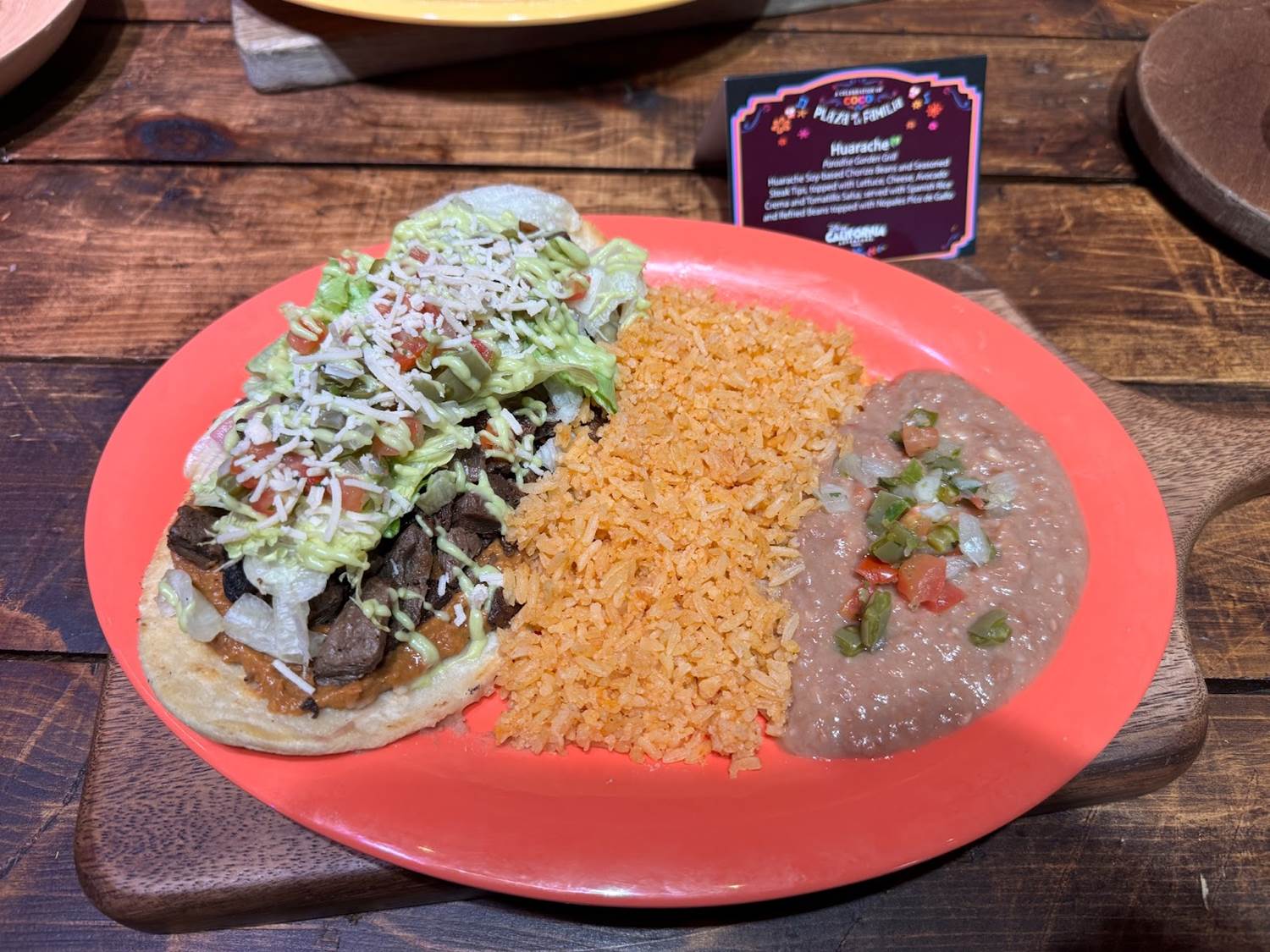 - Huarache with soy chorizo beans and seasoned steak tips topped with lettuce, cheese, avocado crema, and tomatillo salsa and served with Spanish rice and refried beans topped with nopales pico de gallo (Plant-based)