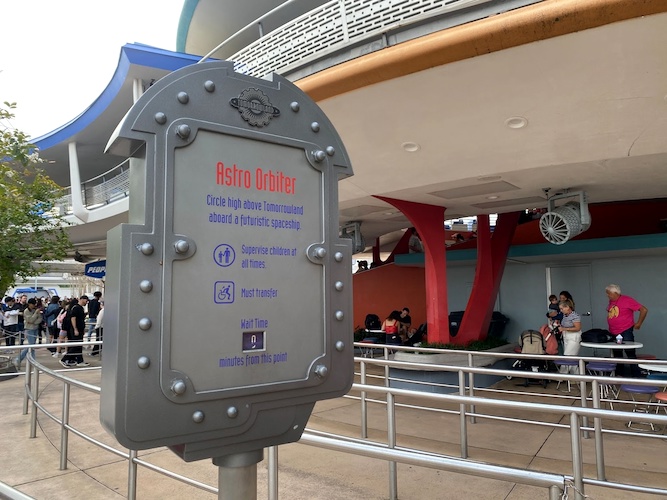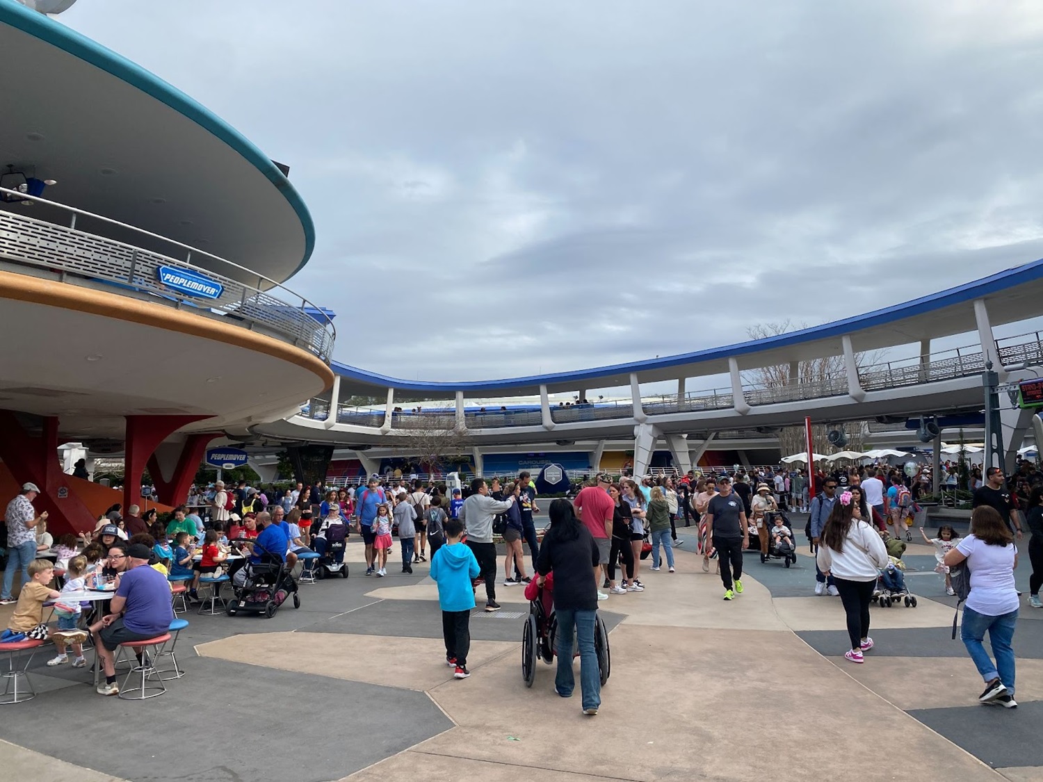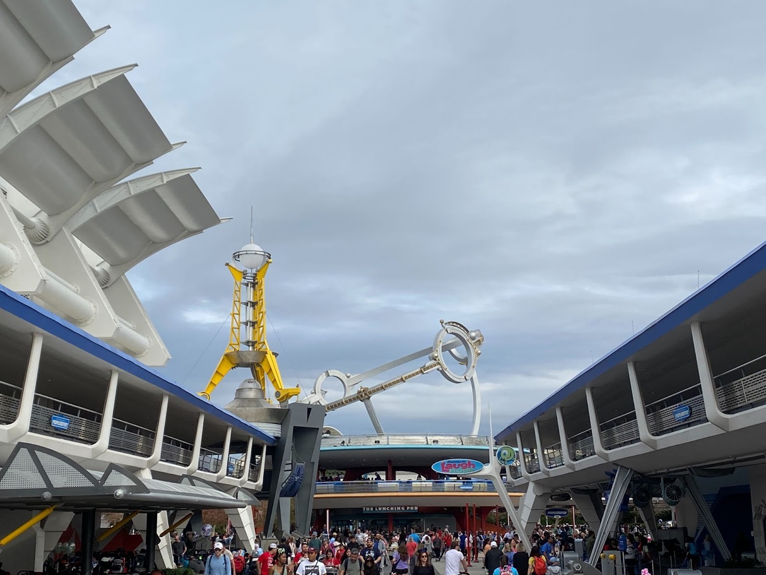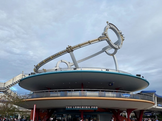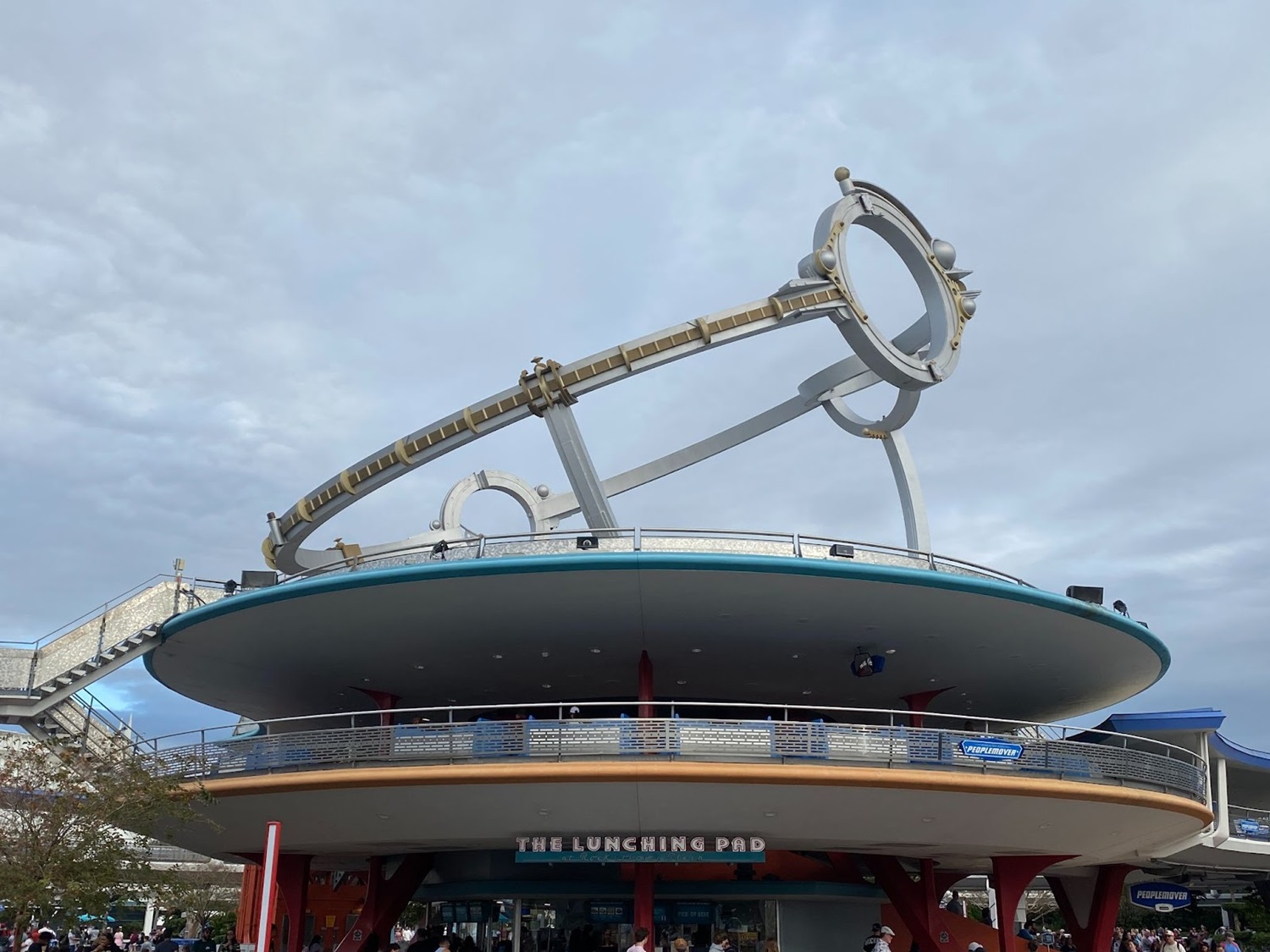 - From the entrance of Tomorrowland, the elevated platform looks a tad barren without the iconic flat ride sitting on top.