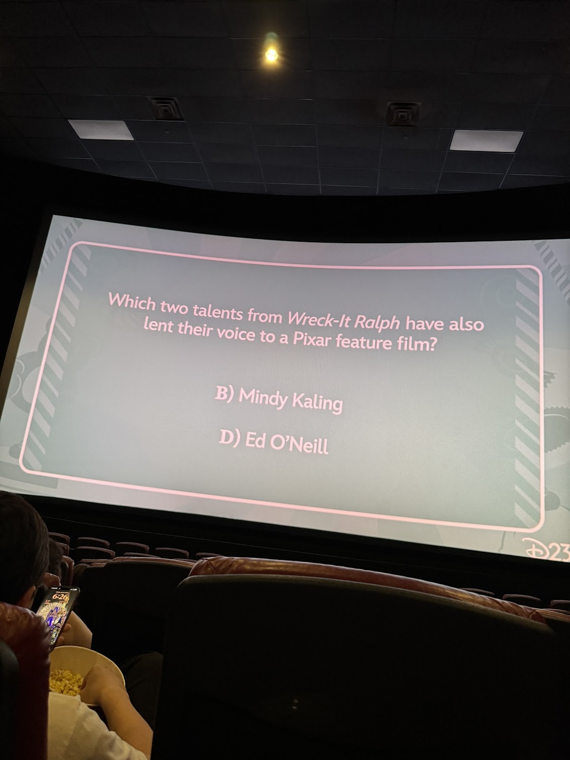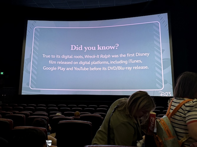 The theater filled up well ahead of the screening start time, and the audience was treated to Wreck-It Ralph trivia and images from prior D23 events, as well as art from the movie while three of the songs from the film’s soundtrack played on a seemingly endless loop that will have everybody to “S-U-G-A-R jump into their racing car" again and again. Also featured, “Shut Up and Drive" by Rihanna, from the film’s soundtrack and played no less than four times.