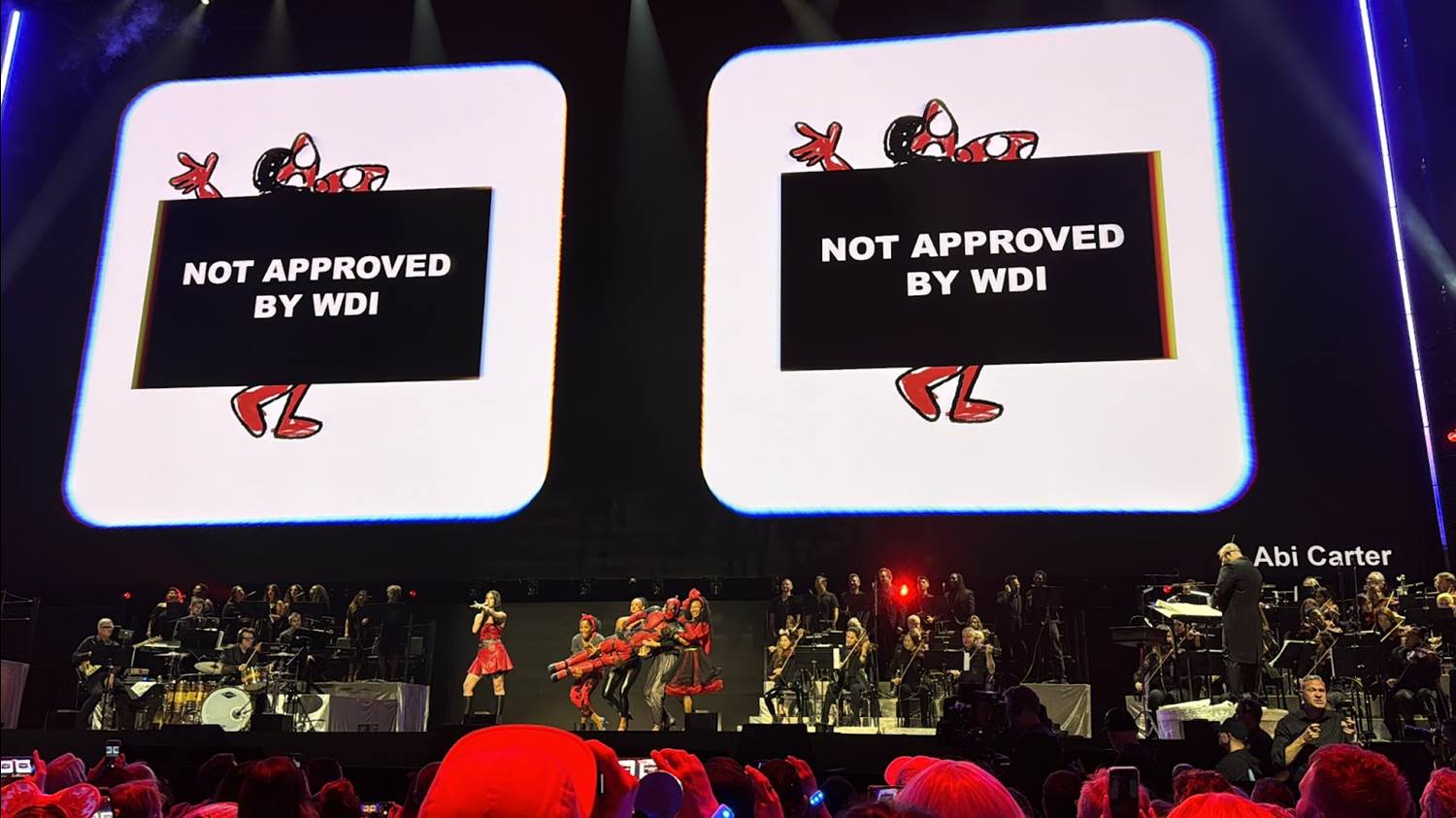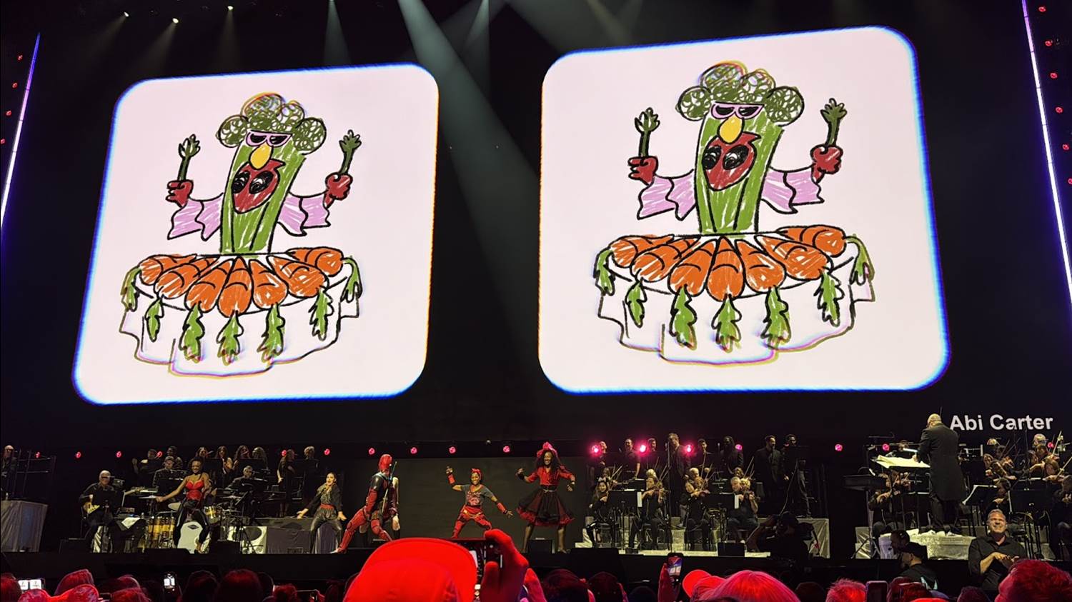 - During the performance, a number of sketches of Deadpool inserted into various Disney Parks situations came across the screen, such as: