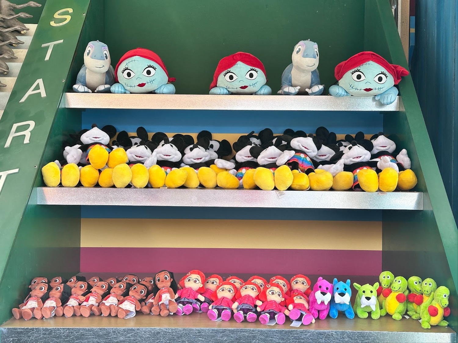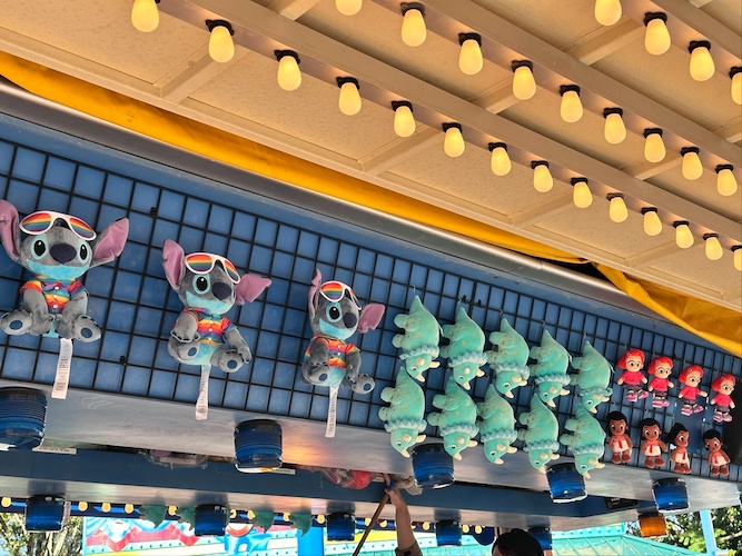 As DinoLand U.S.A. slowly heads towards extinction, popular DINOSAUR-themed prizes have begun to run out at the Fossil Fun Games found throughout Chester & Hester’s Dino Rama. Featuring the Dino Institute logo, the popular iguanodon and triceratops plush prizes are still available in very limited numbers throughout the soon to be closed area. Other Disney plush have filled the shelves of the offering, including Mickey, Sally, Moana, Mei and Stitch.