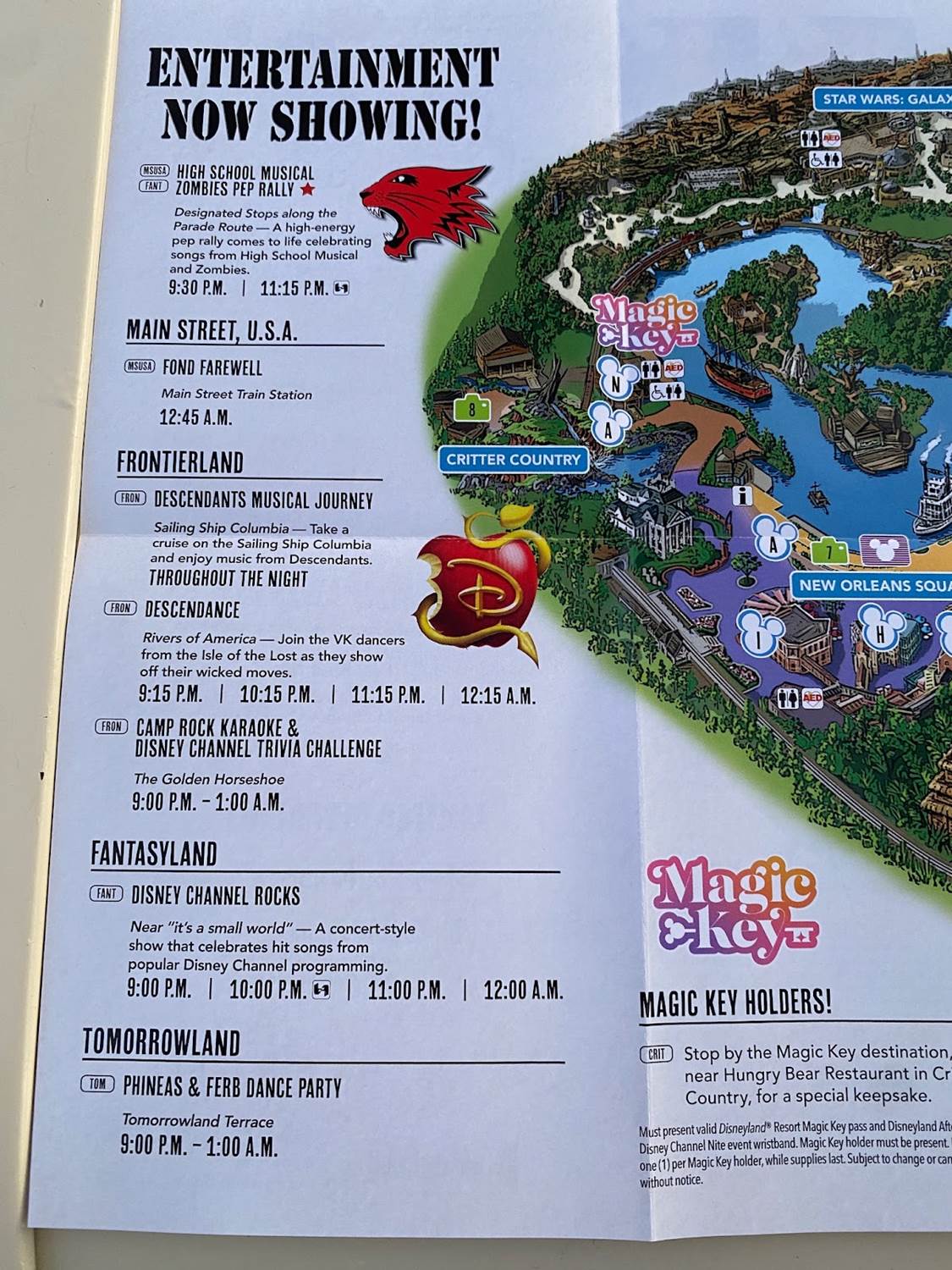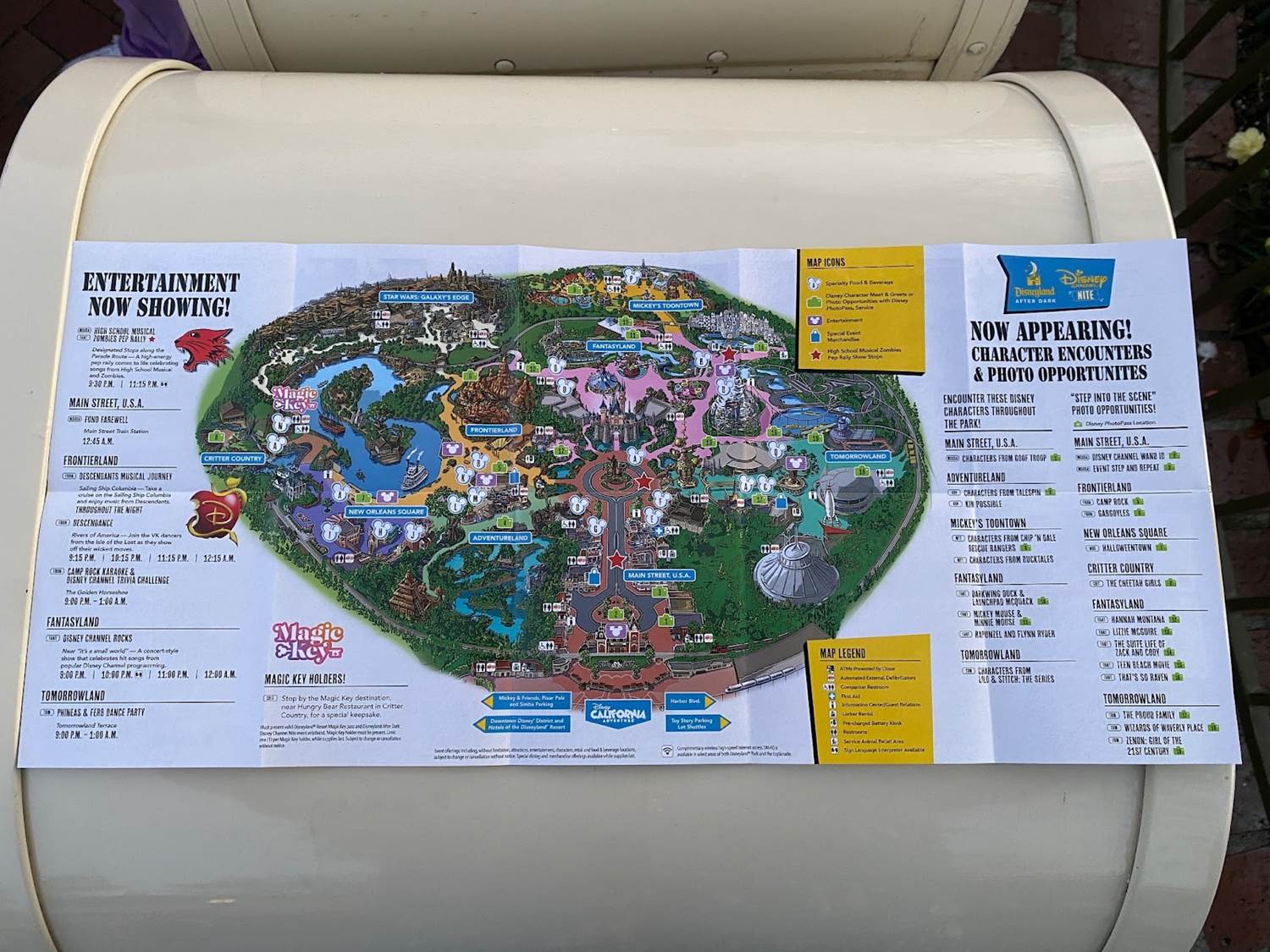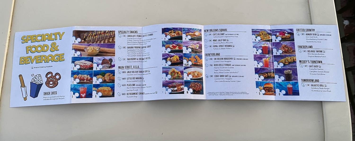 Inside, the map of Disneyland Park notes what attractions are open, along with special entertainment and character encounters.