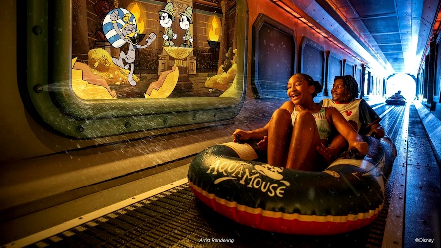 Onboard the Disney Treasure, AquaMouse introduces an all-new storyline that follows Mickey Mouse and Minnie Mouse on a zany misadventure into an ancient temple. Guests will journey with the pair as they embark on a tour of mysterious ruins for a glimpse of the legendary treasure within and encounter a series of hilarious mishaps and booby traps that take the trek in unexpected directions.
