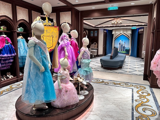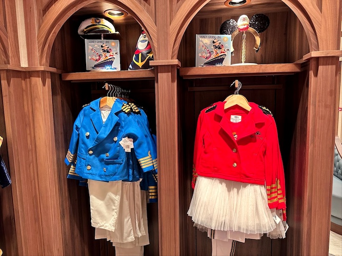 The display area offers a wide array of Disney Princess inspired outfits, including Tiana, Elsa, Anna, Rapunzel and more. Exclusive to Disney Cruise Line, small guests can even pick out looks inspired by Captain Mickey and Captain Minnie as they sail through the Caribbean.
