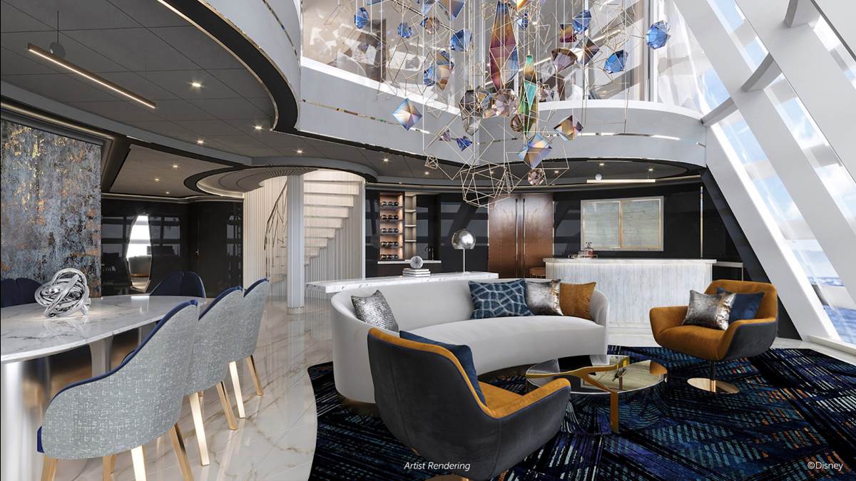 - Embracing the adventures of the future, the Tomorrow Tower Suite will capture the same forward-thinking mindset that inspired the Walt Disney World Resort theme park, EPCOT, with an energetic design. Throughout the suite, dynamic art pieces, molten metal accents and futuristic, colorful glass accents will evoke the distinct atmosphere of EPCOT’s World Discovery neighborhood. Set high in the ship’s forward funnel, this one-of-a-kind suite will overlook the top deck of the Disney Treasure and glimpse the open horizon through an expansive two-story window. With nearly 2,000 square feet of living space, the Tomorrow Tower Suite will comfortably sleep eight guests and feature areas for eating, sleeping and playing, as well as other perks like a full kitchen and private ensuite elevator.