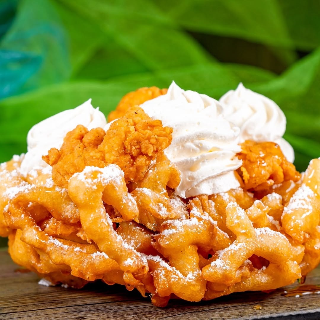 - Chicken and Funnel Cake at Stage Door Café: Funnel cake, chicken tenders, and whipped syrup with powdered sugar and whipped cream