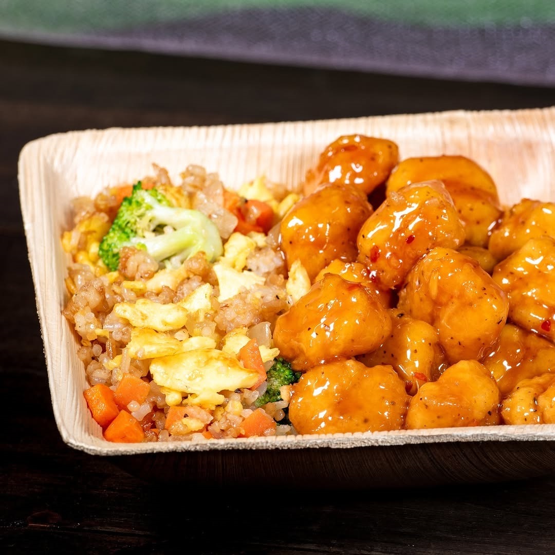 - Orange-glazed Chicken Bowl at Bengal Barbecue: Garlic fried rice, scallions, and orange sauce