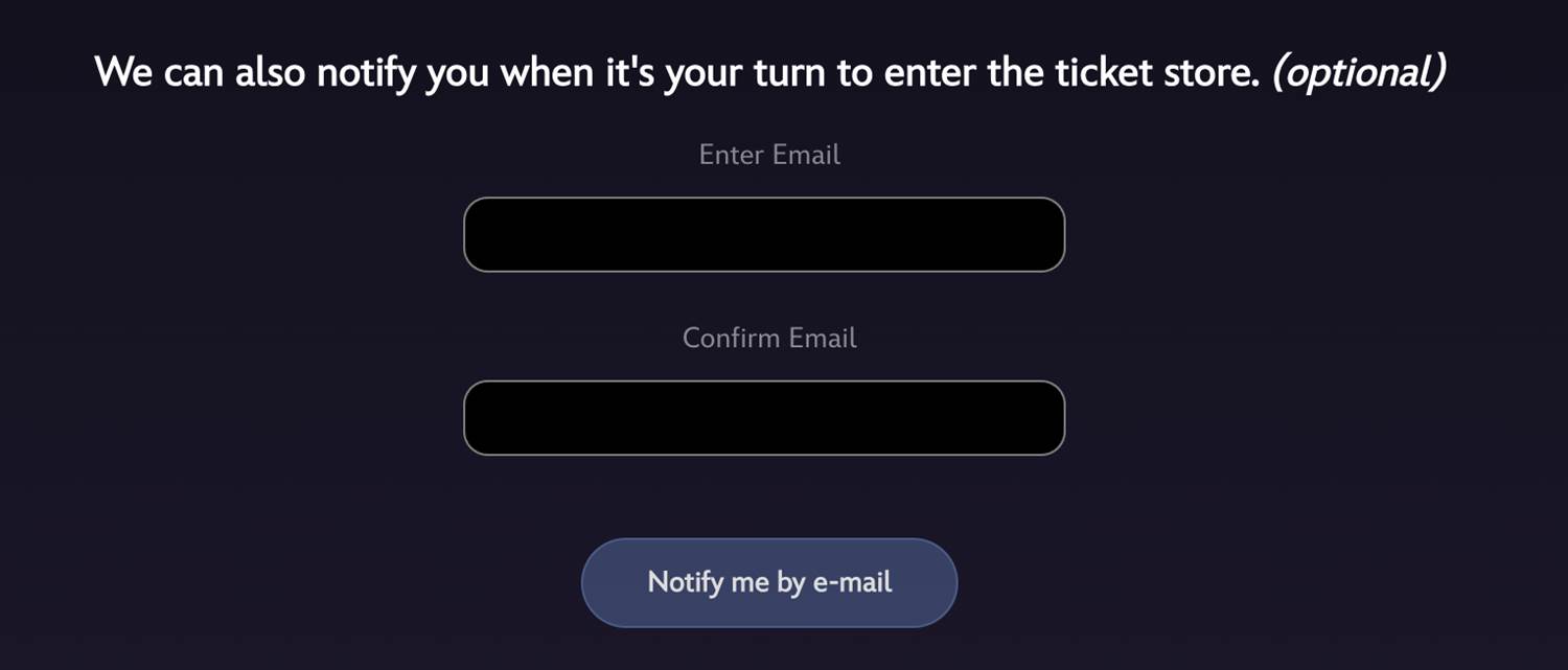 - You’ll then receive a second email letting you know it’s your turn to return to the waiting room in order to enter the ticket store site.